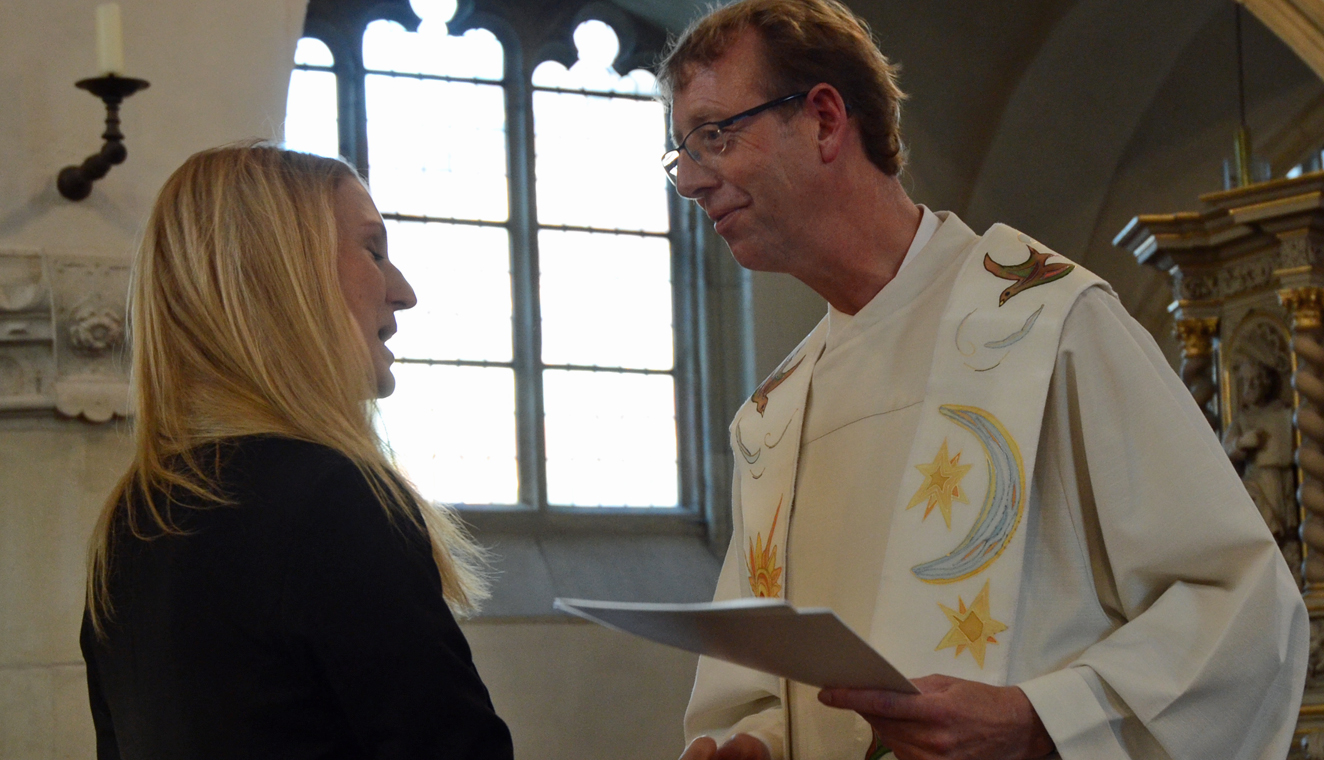 Die Heilige Messe unter dem Leitwort „Du bist“, die die Übergabe der von Bischof Dr. Felix Genn unterzeichneten VKU einrahmte, zelebrierte Pfarrer Thomas Laufmöller aus der Pfarrei St. Liudger, Münster. Er knüpfte in seiner Predigt an das Tagesevangelium an, in dem Jesus Christus seine Jünger fragt, für wen die Menschen im Allgemeinen und die Jünger im Speziellen ihn halten. In diesem Sinne fragte auch Laufmöller die angehenden Lehrerinnen und Lehrer nach ihren innersten Wünschen, Begabungen, Grenzen und Überzeugungen. „Wahrhaftigkeit war und ist immer wichtig“, betonte er. Die Kirche habe viel davon eingebüßt, was auch auf den Schultern der Referendare laste.