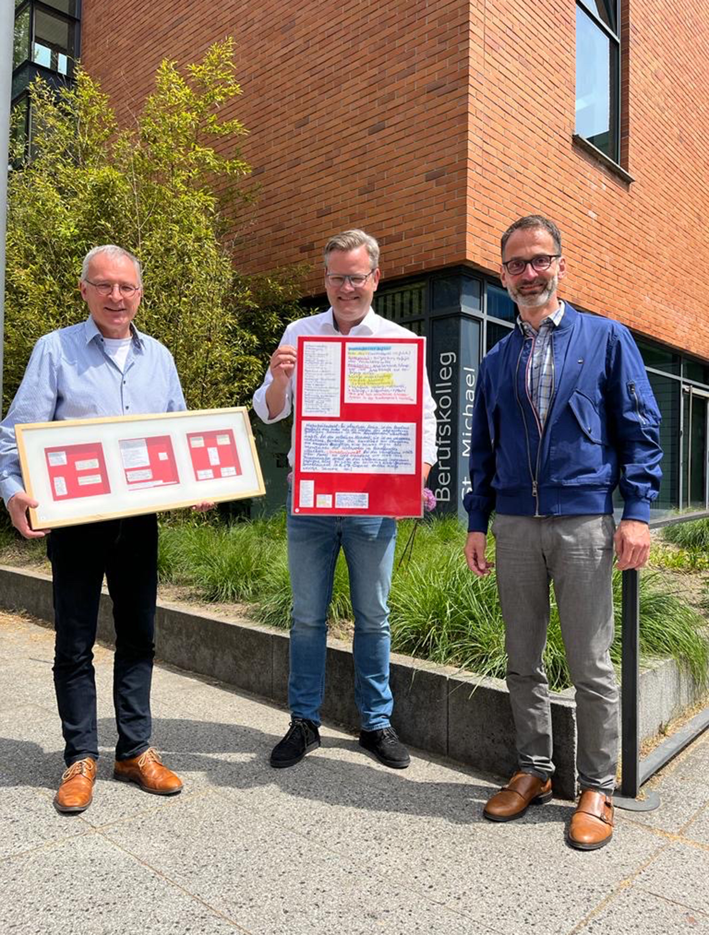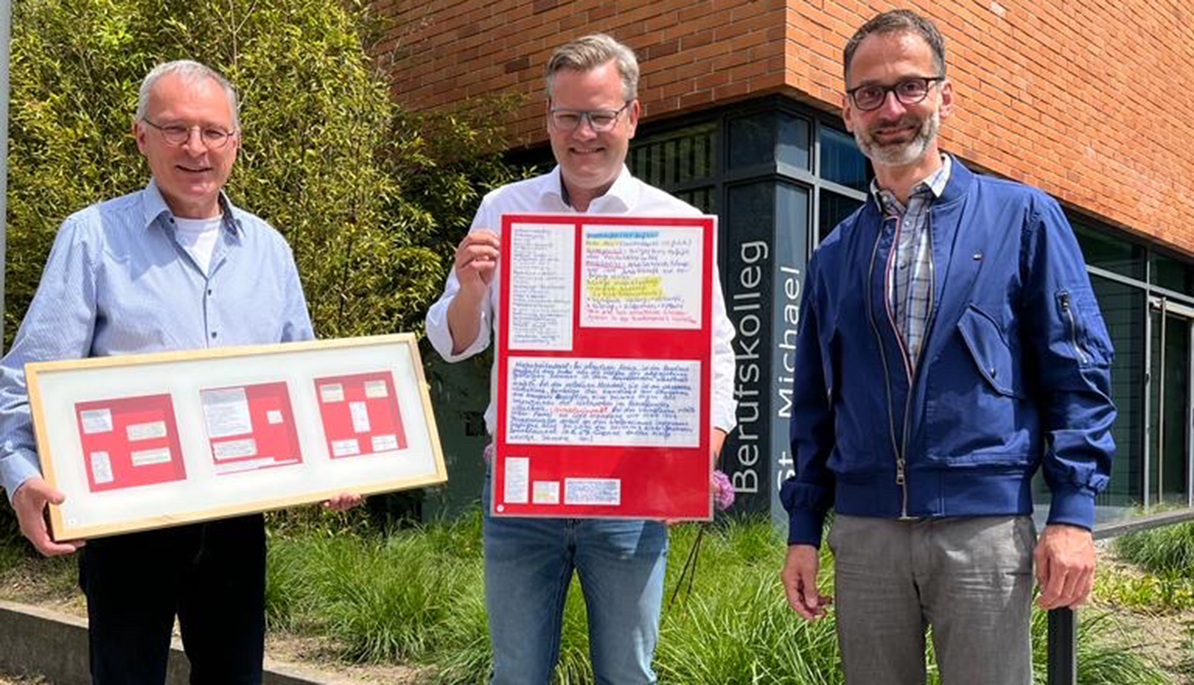 (von links) Johannes Gröger und Schulleiter Jens Beckmann überreichten die Spickzettelsammlung an Dr. Bernd Apke vom Westfälischen Schulmuseum Dortmund.