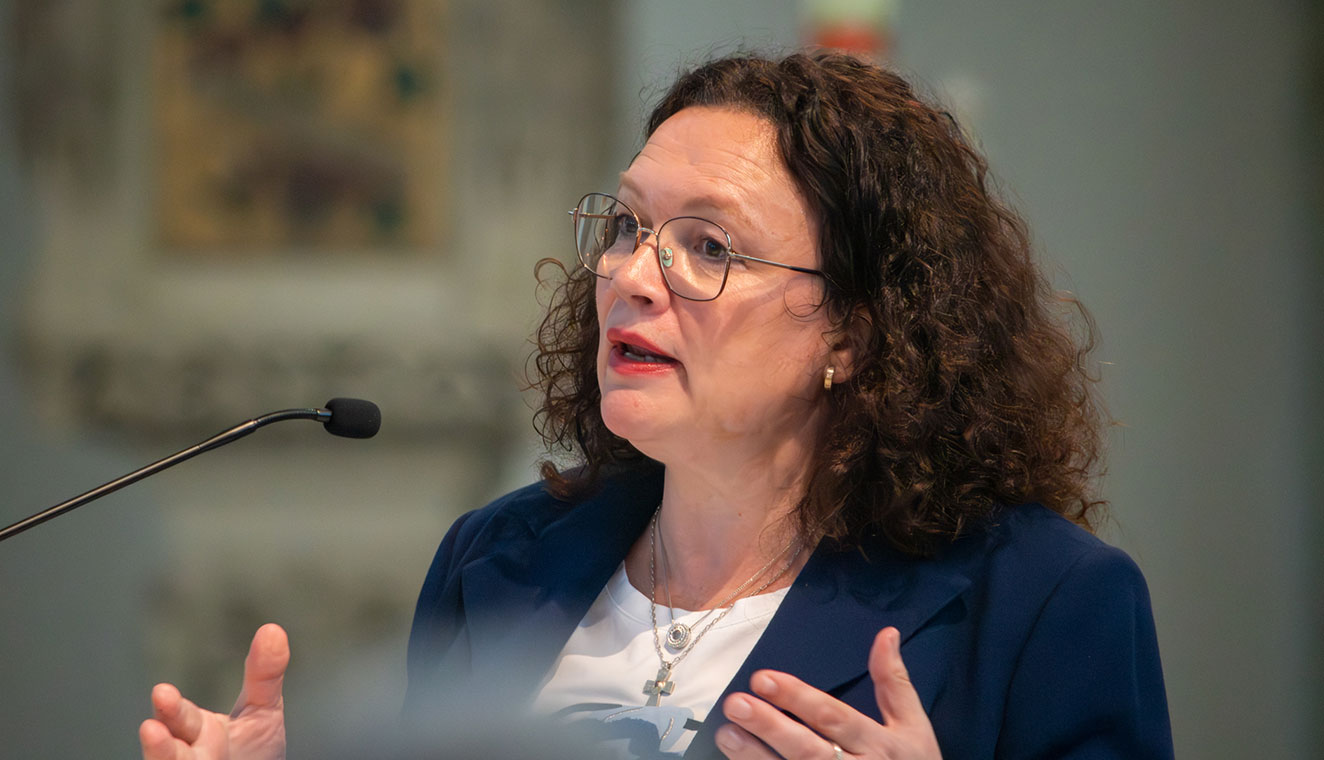 Besonders entschieden warnte Nahles, die in der Eifel in einer katholisch geprägten Familie aufgewachsen ist, vor der religiösen Rechtfertigung von Gewalt. Mit Blick auf aktuelle internationale Debatten erinnerte sie daran, dass der christliche Glaube unvereinbar mit Krieg sei. Niemand dürfe Gott benutzen, um Krieg zu rechtfertigen, habe Papst Leo in Richtung von Donald Trump Stellung bezogen. Gott sei nicht „der Gott derjenigen, die Blut vergießen“, sondern der Gott des Lebens. Daraus folge unmissverständlich: „Selig sind die, die Frieden stiften und nicht die, die dem Krieg dienen.“ Sie dankte dem Papst für seine klaren Worte gegenüber einem Präsidenten, bei dem Religion zu einem Machtanspruch werde. „In diesen Tagen bin ich gern Katholikin“, bekannte sie.