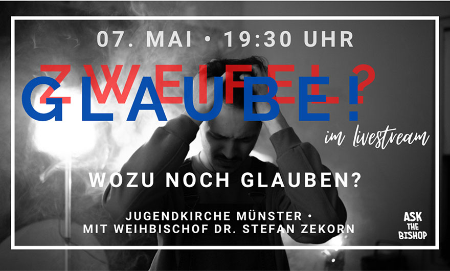 Das Thema „Wozu soll ich noch glauben?“ haben die Jugendlichen mittels einer Umfrage bei Instagram selbst gewählt. „Der Glaube ist etwas sehr Persönliches und kann, wie das Leben selbst, von Höhen und Tiefen geprägt sein“, erklärt Eva Brambrink vom Team der Jugendkirche Münster. Auch Zweifel gehörten dazu. „Wenn ich auch mal zweifle, dann bedeutet das, dass ich nicht alles so einfach annehme, sondern mich ganz bewusst einer Situation oder bestimmten Fragen stelle“, verdeutlicht die pastorale Mitarbeiterin die Gedanken, die sich das Team aus ehrenamtlichen jungen Menschen zu dem Thema gemacht hat. „In welchen Situationen und Momenten habe ich gezweifelt? Was kann mir der Glaube geben? Und wie kann aus Zweifel Glaube werden?“ Für diese Fragen gibt es beim nächsten „Ask the bishop“-Abend Raum.
