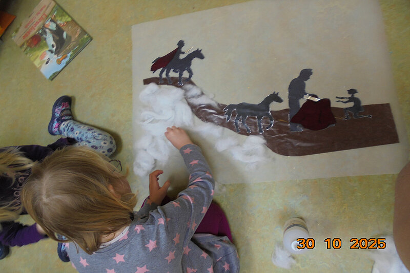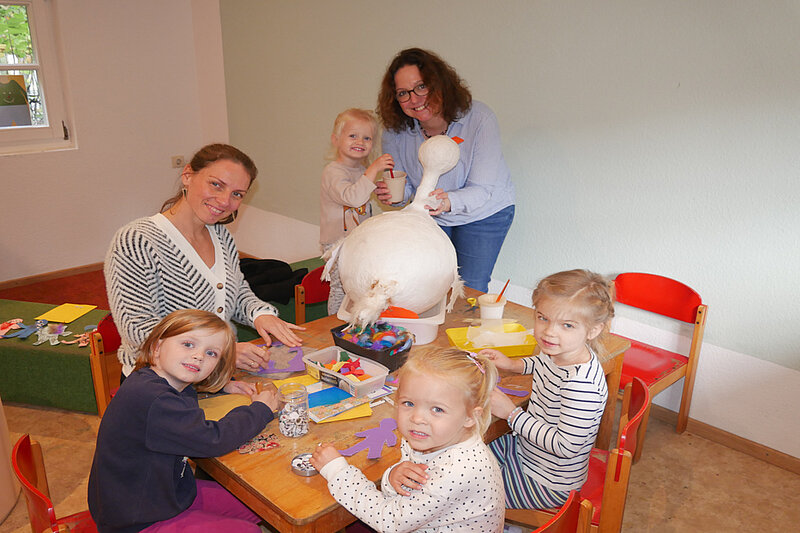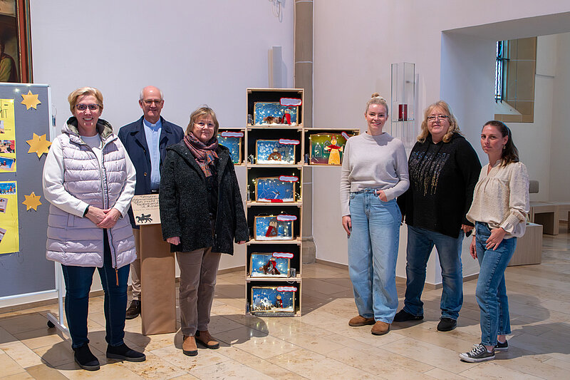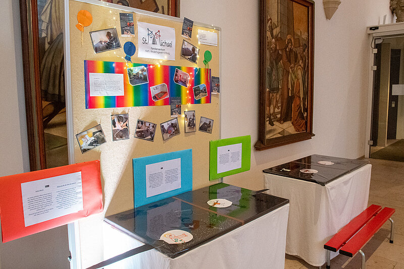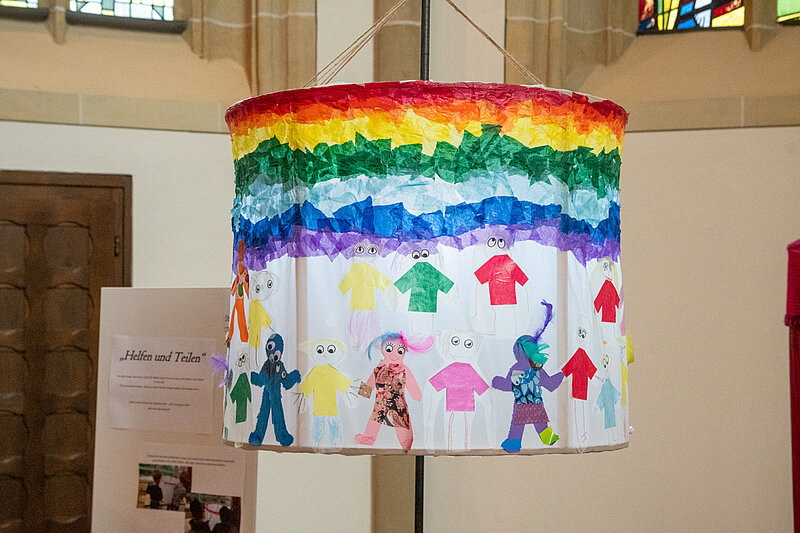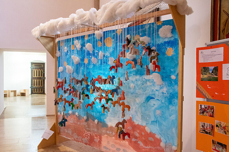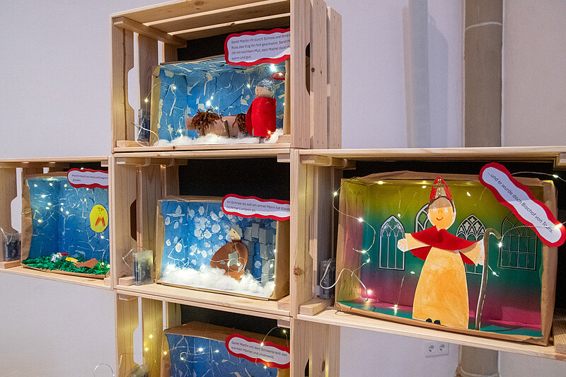 Die vier Kindertageseinrichtungen präsentieren in der Kirche Basteleien rund um das Thema „Von der Kunst zu teilen“: St. Ludgerus präsentiert vier Laternen, darunter auch eine mit dem Mantel des St. Martins, an dem Besucher ihre Wünsche heften können. Die Kita St. Michael überträgt Szenen aus der Martinsgeschichte in die heutige Zeit und stellt diese vergleichend dar. Die Kinder der Kita St. Johannes bastelten kleine Pferde, die vor einem blauen Himmel so aufgehängt wurden, dass sie ein großes Pferd bilden. Die Kindertageseinrichtung St. Marien stellt die Geschichte des Heiligen St. Martins in Schuhkartons dar, die sie in einem Kreuz aus Holzkisten präsentieren. In der Gestaltungszeit war eine Sache den Erziehern besonders wichtig: alle Kinder miteinzubeziehen.