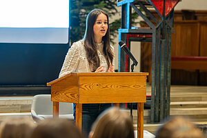 Schülerin Pia Botzenhardt, Sprecherin des Gremiums, stellt eine Frage in den Raum, die viele aufhorchen ließ: „Wer von euch hat noch nie etwas vom Holocaust gehört?“ Dass diese Frage nicht theoretisch gemeint ist, zeigt sie mit Verweis auf eine aktuelle Studie, nach der zwölf Prozent der jungen Erwachsenen in Deutschland keine Kenntnisse über die Verbrechen des Holocausts haben. Für die Schülerin der Q1 war deshalb klar: „Wir wollen ein Bewusstsein schaffen, dass Geschichte nicht nur etwas ist, das in Büchern steht, sondern sich auch auf unsere Gegenwart auswirkt und dass es in unserer Verantwortung liegt, aus ihr zu lernen.“