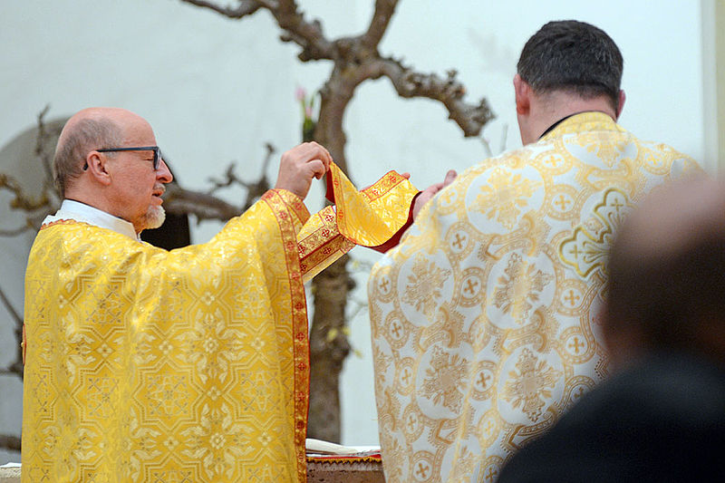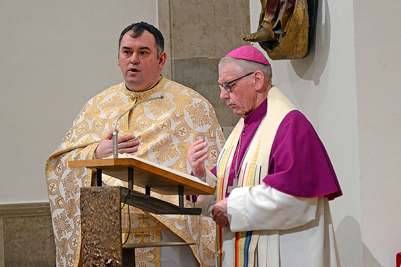 Bischof Genn und Weihbischof Geerlings nahmen an der sogenannten „Göttlichen Liturgie“ der ukrainischen Gemeinde teil, der Pfarrer Myron Molczko vorstand. Zweimal im Monat feiert Molczko mit der münsterischen Gemeinde im Kapuzinerkloster den Gottesdienst in ukrainischer Sprache. Im Anschluss gibt es Kaffee und Kuchen für alle. „Der Gottesdienst ist für alle Sinne gemacht“, sagte Bischof Genn in seiner Predigt. „Immer wenn ich der Göttlichen Liturgie mit ihren Ausdrucksformen begegne, finde ich gerade in der Schönheit dieser Gebetsform – mit den Gesängen, der Musik, den goldenen Gewändern und dem Weihrauch – eine konkrete Umsetzung der Aufforderung ‚Verherrlicht Gott!‘“, erklärte er.