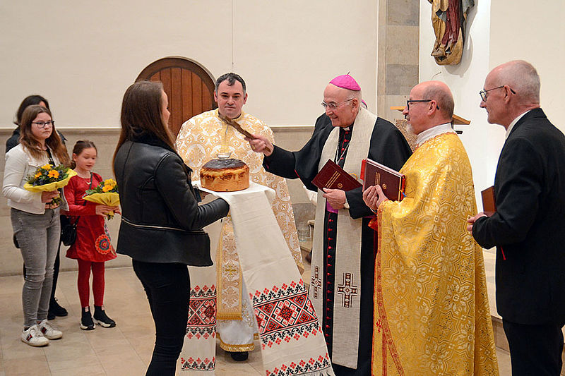 Vor dem Gottesdienst hatte sich Genn mit Verantwortlichen aus der ukrainischen Gemeinde zu einem Gespräch getroffen. Der Bischof erkundigte sich bei dieser Gelegenheit auch nach der Lebens- und Arbeitssituation der Ukrainer. Nach der Messe lud die Gemeinde den Bischof zum Essen ein. Bei landestypischen Spezialitäten und Köstlichkeiten nutzte Genn die Gelegenheit, um mit den ukrainisch-sprachigen Katholiken ins Gespräch zu kommen.