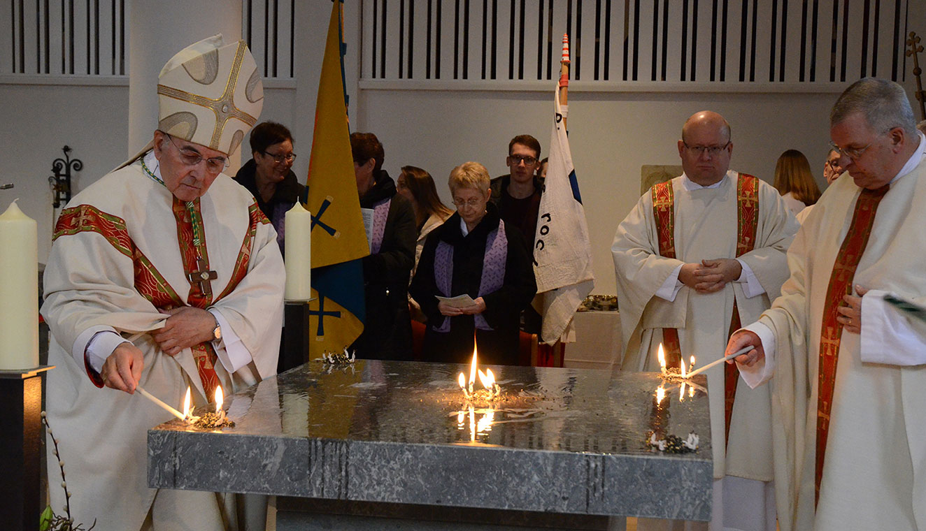 Dann sprach Genn die Erwachsenen an und ging auf das Feuer ein. „Wir entzünden Feuer auf dem Altar. Es ist ein Zeichen dafür, dass Gott für uns brennt, dass er Feuer und Flamme für uns ist“, erläuterte der Bischof. Das Kommen Gottes geschehe aus reiner, voraussetzungsloser und bedingungsloser Liebe. „Nicht weil jemand dieses oder jenes geleistet hat, sondern weil du ‚du‘ bist als Mensch. Das ist die Botschaft des Christentums.“ Dieses Kommen Gottes geschehe bis hin zum Kommen am Kreuz, mitten hinein in alle Ungerechtigkeit und Bosheit. „Da stellt er sich hin wie ein harmloses, unschuldiges, machtloses und ohnmächtiges Lamm. Er begibt sich als Gottessohn dahinein und kehrt die Mächte der Bosheit um. Er verwandelt sie in Leben und die Chancen sowie Möglichkeiten, lieben zu können“, betonte Genn. Auf dem Altartisch jeder Gemeinde werde deutlich, dass dieses Lamm die Sünden der ganzen Welt trage. Dies werde immer wieder in der Eucharistie gefeiert. „Dafür lohnt es sich, dass sich eine Gemeinde engagiert, einen Altar errichtet und neu konstruiert, wenn die Notwendigkeiten sich ergeben. Deshalb wird die Weihe so spielerisch gefeiert. Mitten im Alltag, wo alles sich verflachen kann, denken wir daran, dass es jemanden gibt, der für uns Feuer und Flamme ist“, sagte Genn.