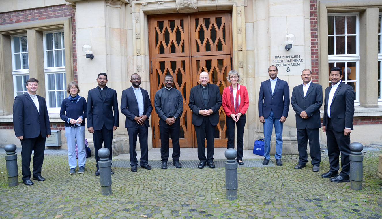 Bildunterschrift: Bischof Dr. Felix Genn haben die neuen Priester der Weltkirche schon kennengelernt: (von links) Pfr. Cristian Ignat, Astrid Quick (interkulturelle Trainerin), Pfr. Dr. John Polnedi, Pfr. Emmanuel Ibeke, Pfr. Stephen Okwor, Bischof Genn, Renate Brunnett, P. Seemon Fredy, O. Praem, P. Deepak Dhurwey, O.Praem, P. Joji Sebastian, MSFS.