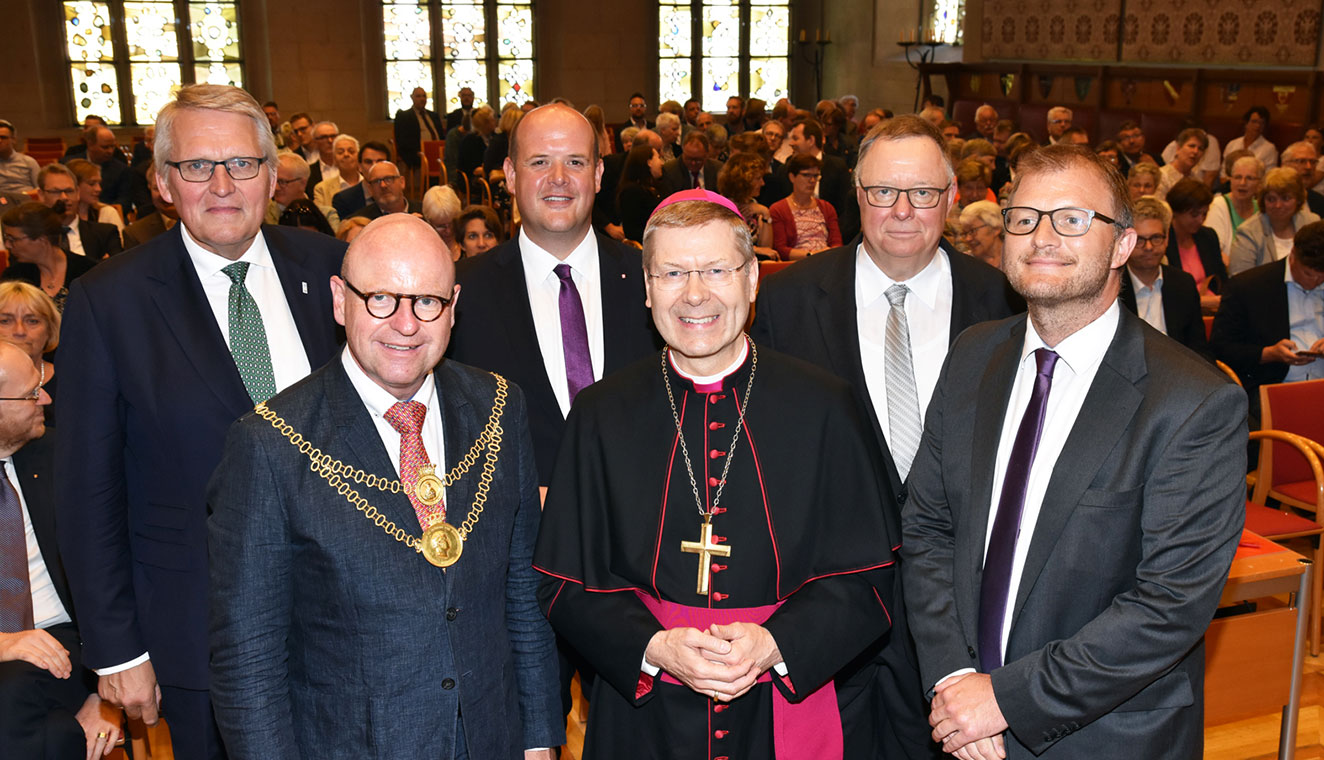 Festredner Prof. Thomas Sternberg, Oberbürgermeister Markus Lewe, Vorstand Sebastian Koppers, Weihbischof Dr. Stefan Zekorn, Caritasrat-Vorsitzender Dr. Jost Hüttenbrink und Vorstand Thomas Schlickum (von links) betonten in Gottesdienst und Festakt die Bedeutung caritativer Arbeit für die Menschen in Münster.