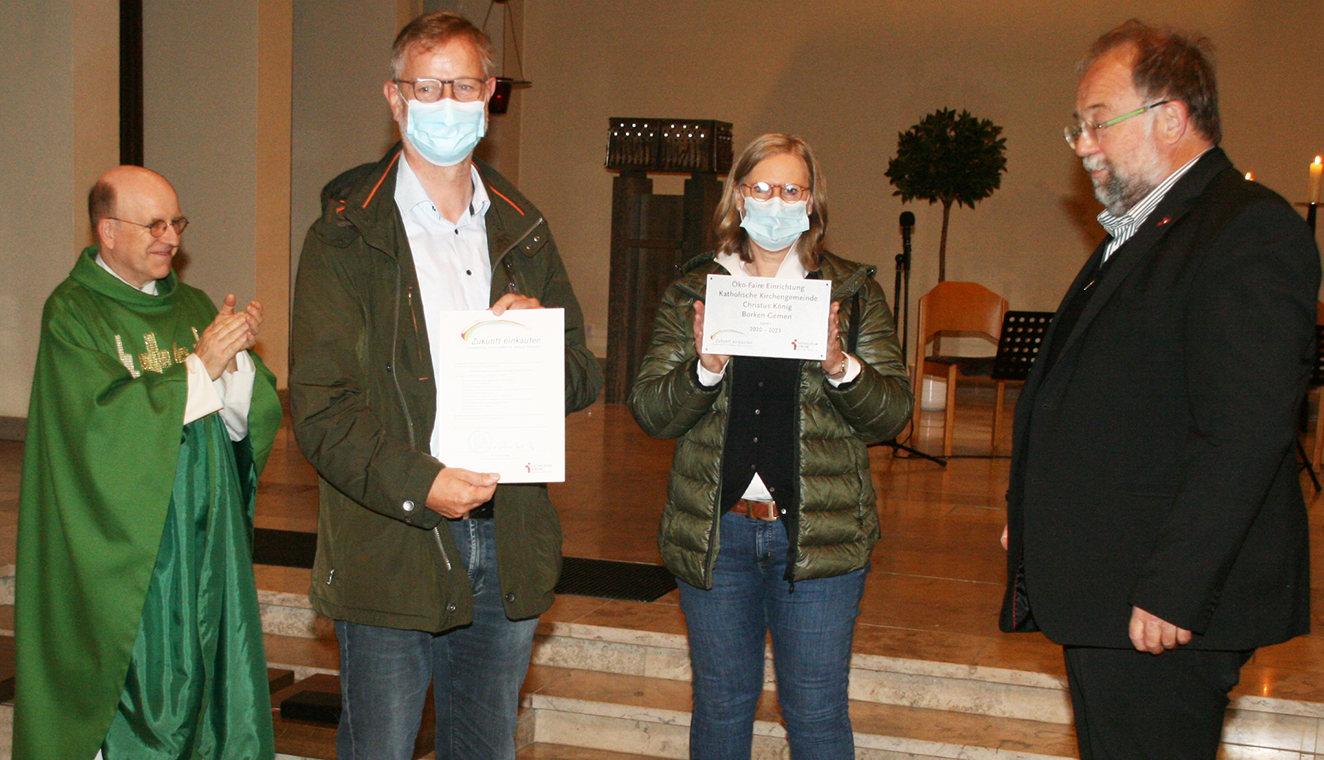 Wie in der Pfarrei Christus König die Zertifizierung gelebt wird, dafür lieferte Peter Sonntag einige Beispiele: „Wir kaufen fair und regional ein, beispielsweise sind die Plätzchen nicht vom Discounter, sondern vom Bäcker um die Ecke.“ Ökologisch sei auch die neue Kohlensäureanlage im Alten Kloster, die verhindere, dass Wasserflaschen über weite Wege transportiert werden müssten. Letzteres konnten die Besucher vor Ort bei einem Umtrunk im Alten Kloster testen.