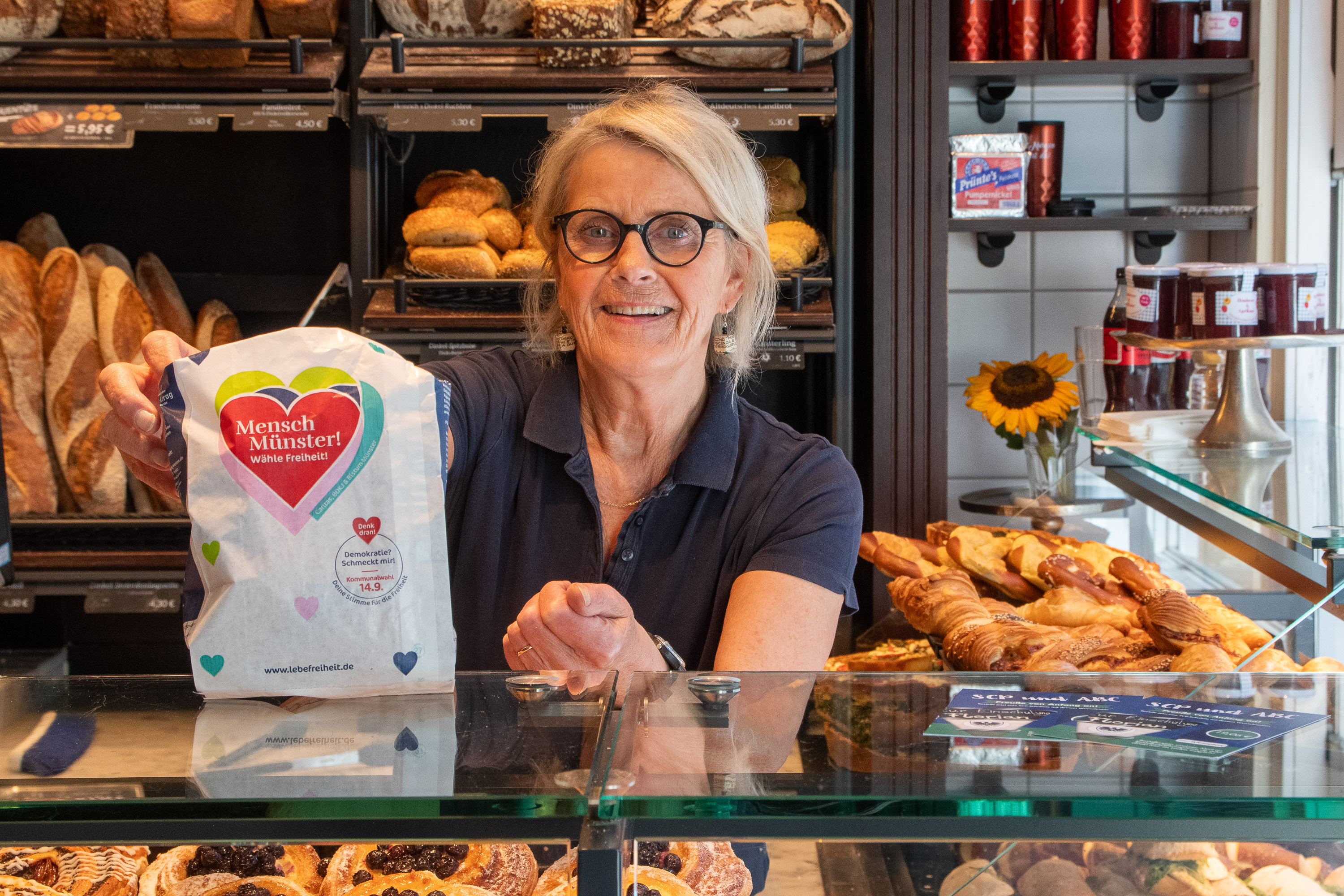 In allen Krimphove-Filialen in Münster gibt es ab sofort Brötchentüten, die das Herzmotiv der Demokratie-Kampagne zeigen.