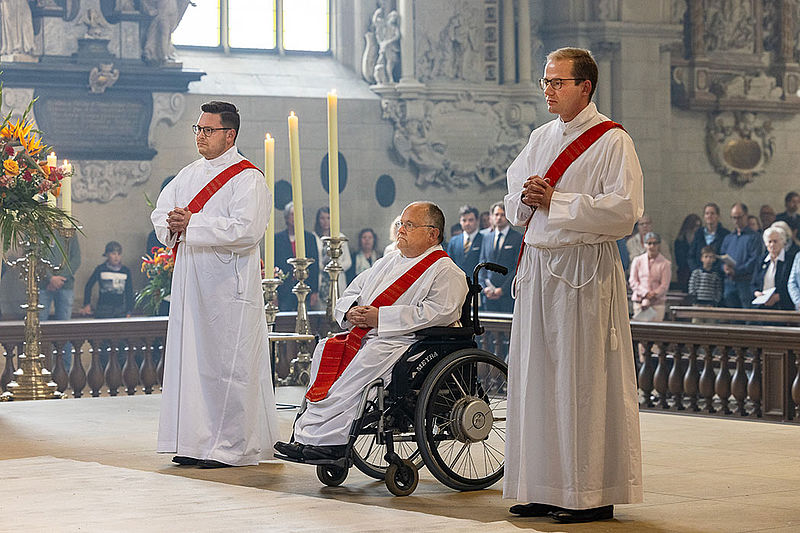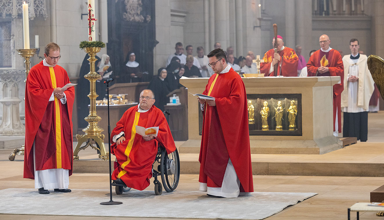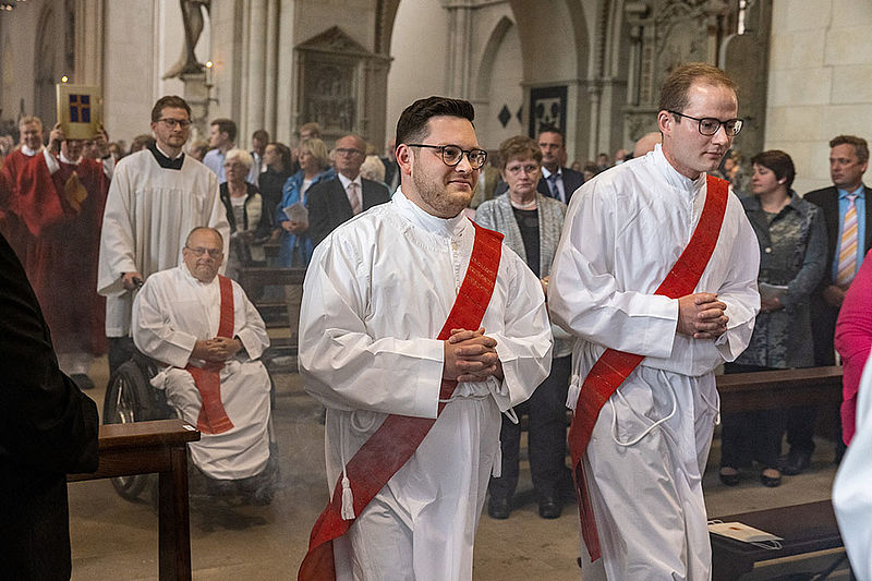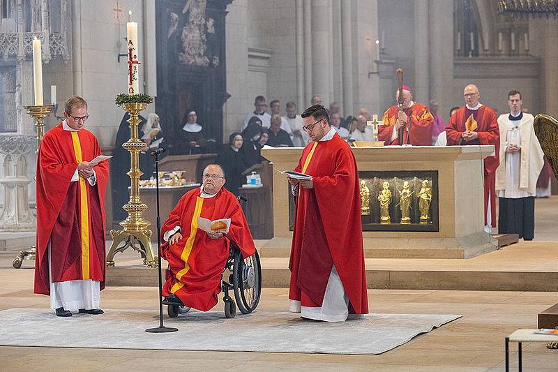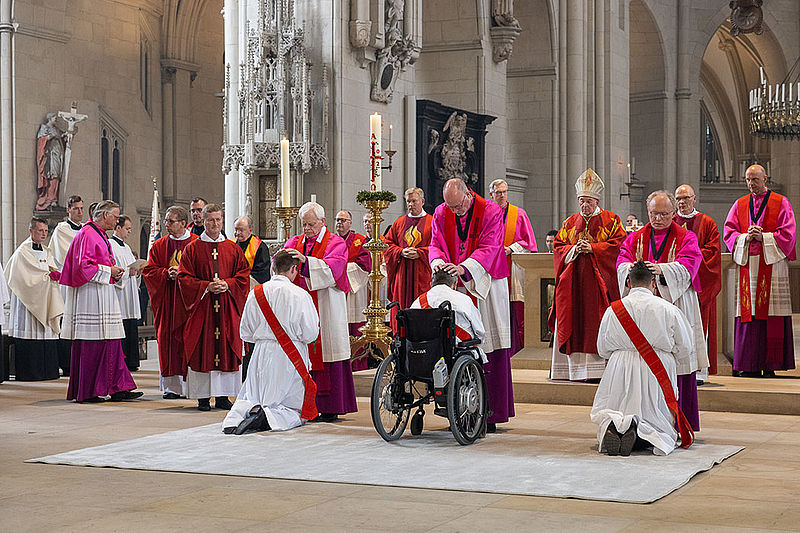 © Bistum Münster„Ich danke Ihnen für Ihren Einsatz und habe Respekt vor Ihrem ‚Ja‘ zu dieser Entscheidung in einer völlig anderen Kirchensituation, als Sie sich diese zu Beginn Ihres Studiums vielleicht vorgestellt haben“, wandte sich der Bischof zu Beginn an die drei Kandidaten. In seiner Predigt versetzte er sich in jene hinein, die die Entscheidung der Männer womöglich nicht gänzlich verstehen können. „Ich habe in den Gesprächen mit den Dreien spüren können, dass sie sich nicht als Menschen verstehen, die eine Rolle in einem Film spielen, sondern dass sie mitten im Leben stehen und aus dieser Mitte heraus etwas weitergeben möchten, das sie selber zutiefst berührt hat“, verdeutlichte er.
