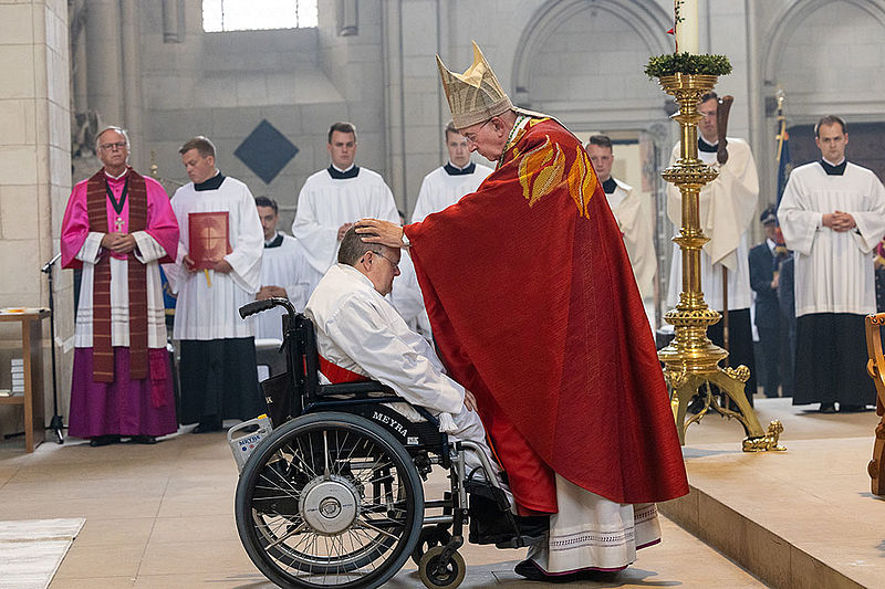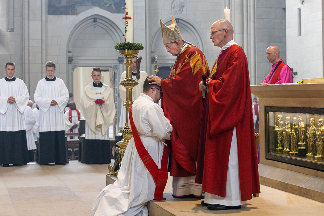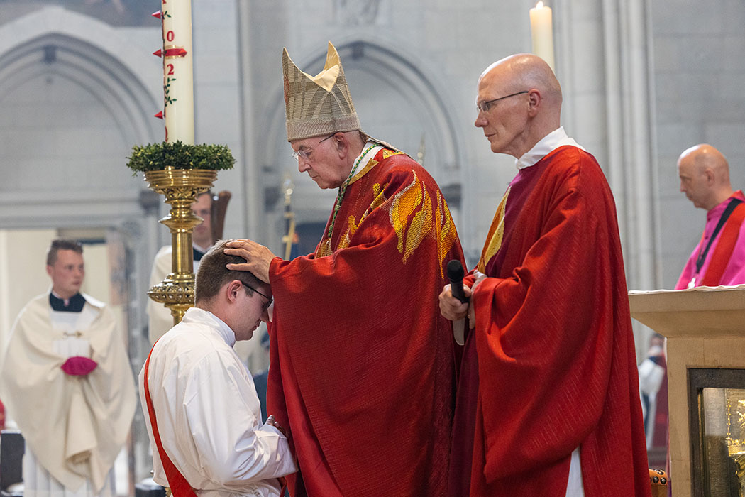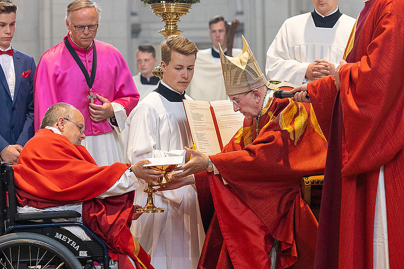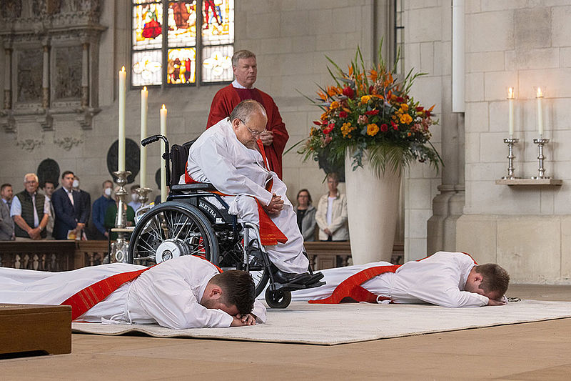 An die Predigt schloss sich die Weihe an. Zum Zeichen ihrer Hingabe an Gott legten sich die Kandidaten nach ihrem Weiheversprechen auf den Boden. Danach legten ihnen der Bischof und einige Priester in Stille die Hände auf, bevor sie Stola und Messgewand als Zeichen ihres priesterlichen Amtes erhielten. Anschließend salbte der Bischof ihre Hände und überreichte ihnen Kelch und Hostienschale. Zum Abschluss der Weihe gratulierte der Bischof Genn den Neupriestern, die nun erstmals beim Hochgebet am Altar mitwirkten.