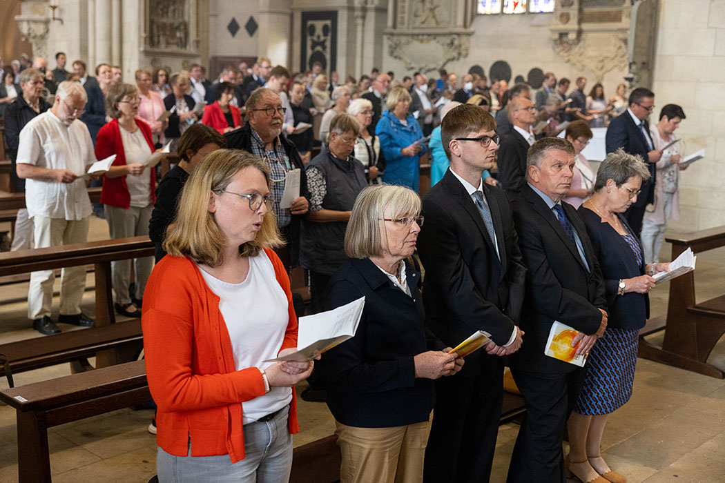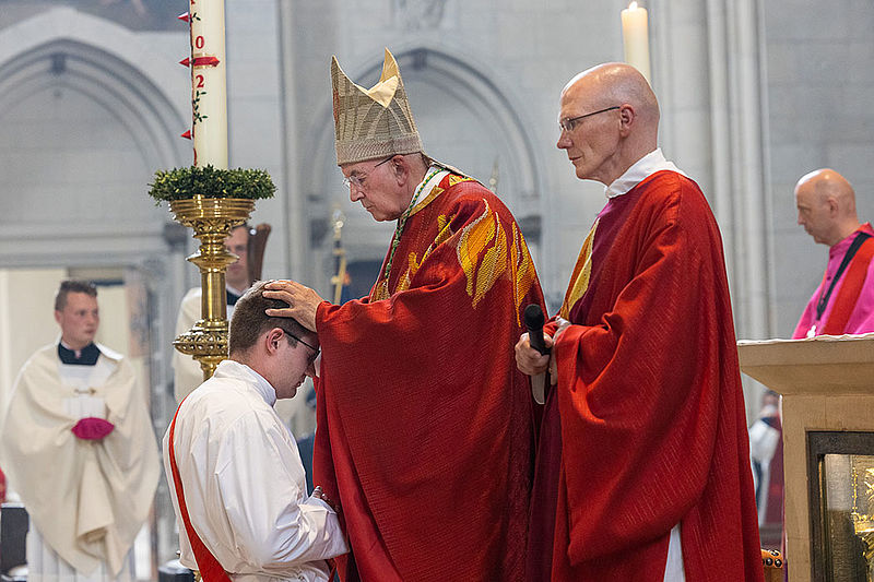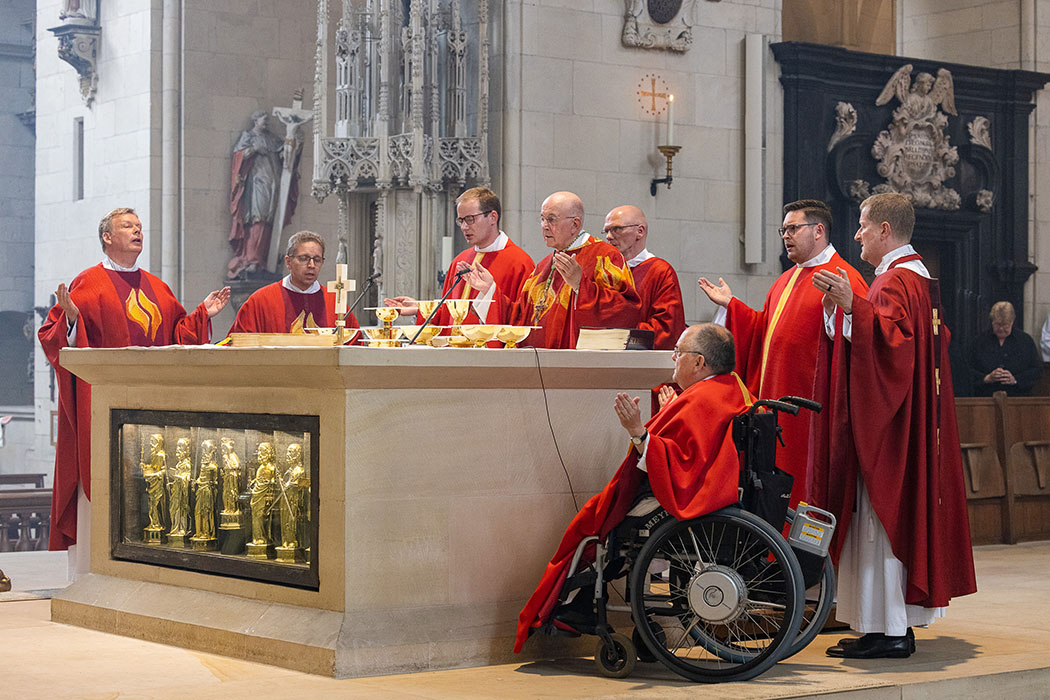 Zugleich bat er die Gläubigen um das Gebet für die Berufung von Priestern: „Wir brauchen Priester, damit in unserer Kirche und in der Welt diese Wirklichkeit Gottes personenhaft anwesend ist.“ Priester zu sein, sei allerdings kein Privileg: „Nur in der Verbundenheit mit allen Schwestern und Brüdern, die mit ihren Geistesgaben in die Welt hineinwirken, kann die frohmachende Botschaft verkündet werden“, schlug Genn die Brücke zu Pfingsten, dem Fest, das alle Grenzen überwinde und Menschen aller Völker, Nationen und Sprachen zusammenbringe. „Der Geist erfüllt uns alle, dann entsteht eine Realität, die sich mit der Lebenswirklichkeit der Menschen verknüpft“, sagte der Bischof, der abschließend mit Blick auf die Welt- und Kirchensituation an das Miteinander appellierte: „Lassen Sie uns bei aller Unterschiedlichkeit zusammenbleiben und davon erzählen, was der Auferstandene bewirken kann, weil er die Welt mit seiner Liebe befeuert.“