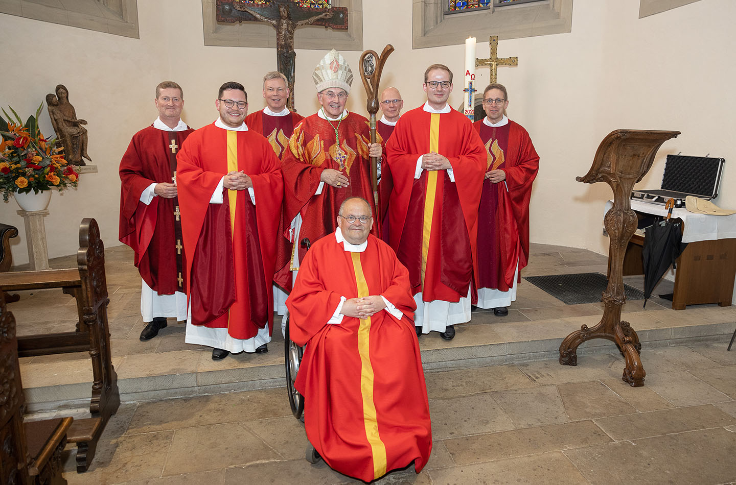 Zusammen mit Bischof Genn und weiteren Begleitern aus der Priesterausbildung stellen sich die Neupriester Lars Rother (2. von links), Matthias Fraune (vorne) und Tobias Eilert (2. von rechts) zum Gruppenbild auf.