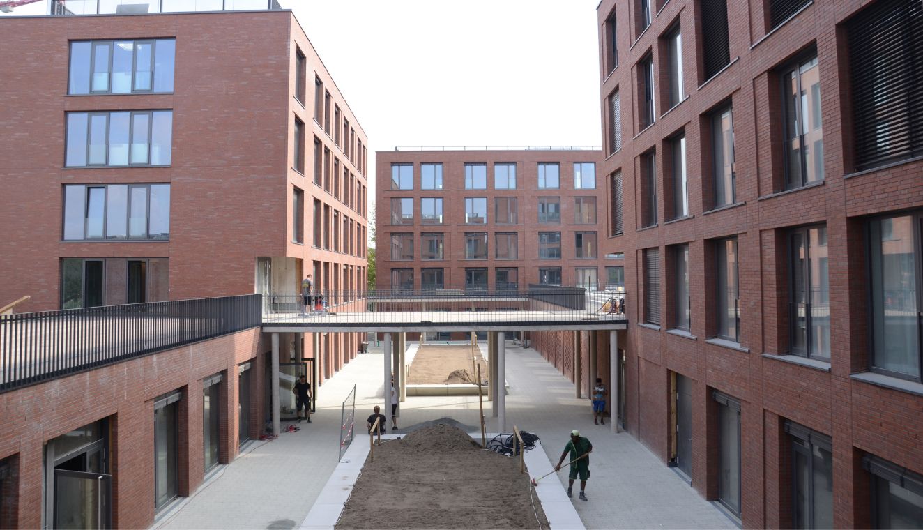 Dass die Handwerker ganze Arbeit geleistet haben, wird schon deutlich, wenn man den Campus über die Verbindungstreppe an der Seite des benachbarten Overberg-Kollegs betritt: Auf der so genannten Verbindungsebene laden die Begrenzungen großer Blumenbeete zum Hinsetzen ein, an dem geplanten Kiosk wird mit Hochdruck gearbeitet. „Mit den finalen Bauarbeiten hängen wir ein bisschen hinterher, aber wir sind definitiv auf der Zielgeraden“, sagt Markus Hoffmann und blickt hoch zum Kran, der noch über dem Campus aufragt, es riecht nach Teer, letzte Fugen auf dem Außengelände werden gefüllt.