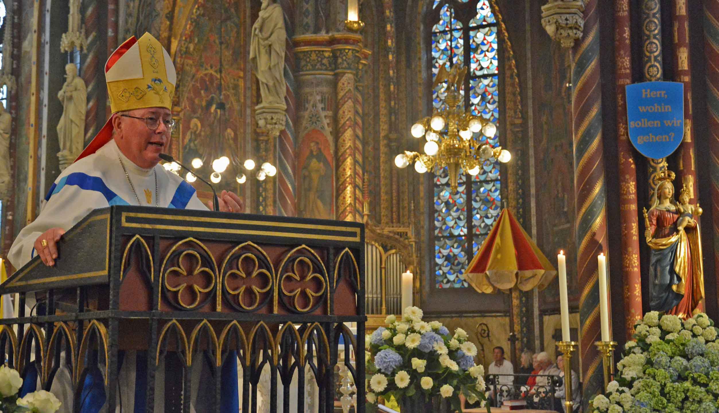 Gott hingegen wolle, dass die Menschen froh sind, das zeige schon die Frohe Botschaft in Form des Evangeliums. Gott verzeihe die Sünden, so dass jeder Mensch jeden Tag neu anfangen könne und nicht in der Vergangenheit stehenbleiben müsse. „Von Gott werden wir nicht verstoßen“, unterstrich Hollerich, „Gott ist mit uns, wenn wir etwas schaffen aber auch, wenn wir scheitern.“