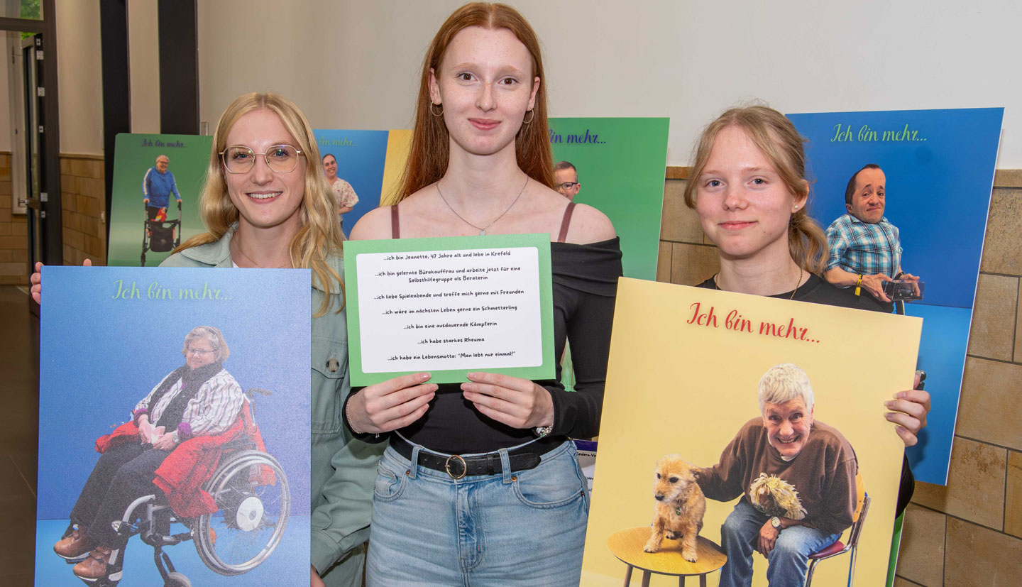 „Ich bin mehr…“ heißt die Ausstellung, die die Fachabiturientinnen des nun bereits verabschiedeten Jahrgangs mit dem Schwerpunkt Gesundheit und Soziales gemeinsam mit ihrem Lehrer Marc Baum konzipiert und umgesetzt haben. „Vor einiger Zeit hatten wir eine ähnlich angelegte Wanderausstellung bei uns im Berufskolleg, die so positiv angenommen wurde, dass sie uns zu einem eigenen Projekt inspiriert hat. Wir wollten Menschen aus dem Gelderland, die mit einer Behinderung leben, porträtieren und sichtbar machen, dass jede und jeder viel mehr ist als die Beeinträchtigung – und damit den Blick auf den ganzen Menschen richten“, erklärt Baum.