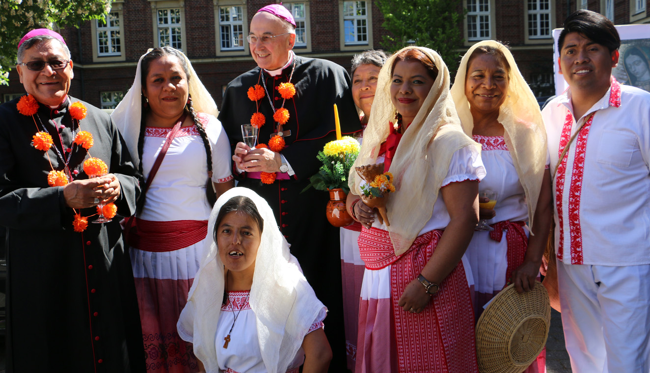 Traditionen aus beiden Ländern prägten die Heilige Messe. So begann sie mit dem „Rito de la flor“, einem indigenen Ritual aus dem Bistum Tula. Dabei wird als Zeichen der Anerkennung Gottes als Schöpfer Weihrauch in die vier Himmelsrichtungen geschwenkt. Zum Schluss verneigt man sich in Richtung Erde und Himmel, als Ausdruck des Dankes für die Nahrung, die die Erde hervorbringt, und für das Leben, das Gott schenkt.