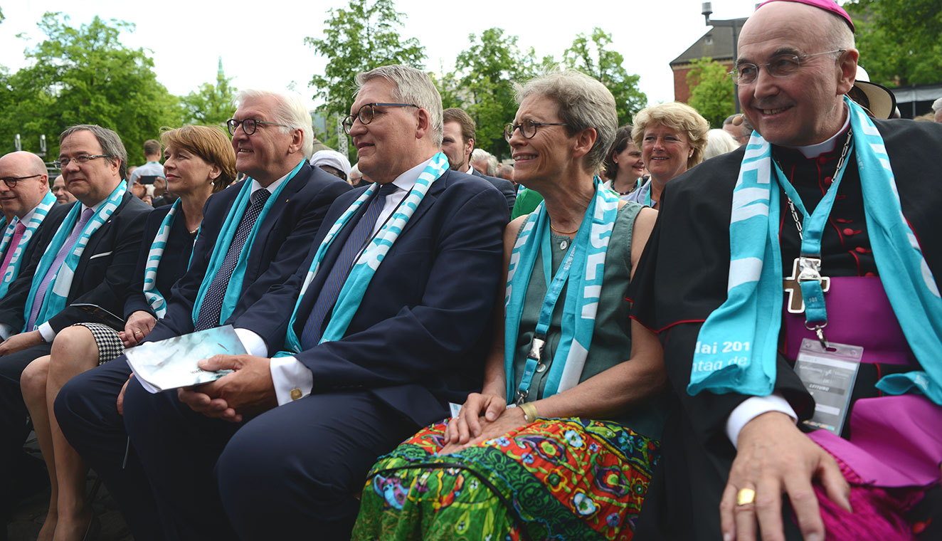 Bundespräsident Frank-Walter Steinmeier hob in seiner Ansprache hervor, wie wichtig das Thema „Frieden“ nicht nur in der Weltpolitik ist, sondern auch und besonders in der deutschen Gesellschaft. „Wie können wir Frieden suchen, Frieden erhalten und Frieden stiften“, fragte das Staatsoberhaupt. Dabei nahm er ebenso Bezug auf die Kündigung des Atom-Abkommens mit dem Iran seitens der USA, das eine atomare Aufrüstung des Iran verhindern sollte, wie auch auf die Debatte darum, dass in bayerischen Behörden ab sofort ein Kreuz im Eingangsbereich hängen wird. „Was sonntags in den Gottesdiensten fehlt, kann das Kreuz im Behördeneingang nicht füllen“, machte Steinmeier deutlich. Glauben sei ein fester Anker in der Gesellschaft, den man ernst nehmen müsse. Trotzdem dürfe der Staat Religion nicht zum Instrument von Politik machen. Mindestens ebenso deutlich wurde er beim Thema Antisemitismus: „Es gibt für Antisemitismus keinen Fingerbreit Verständnis, ob er deutsche Wurzeln hat oder ob er von außen mitgebracht wird.“ Jeder solle in Deutschland seinen Glauben leben können. Ohne Angst, aber auch ohne Machtanspruch.