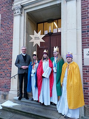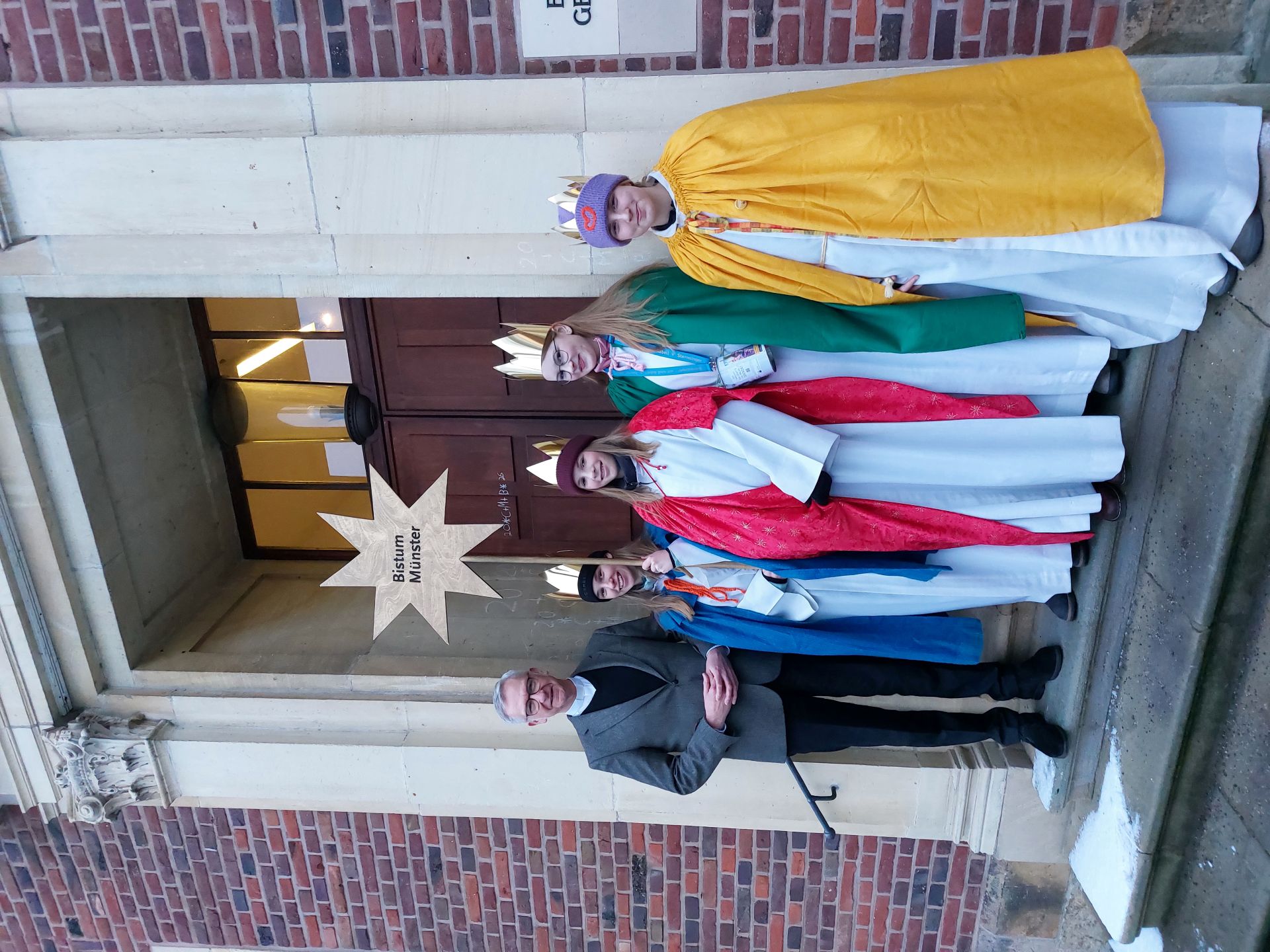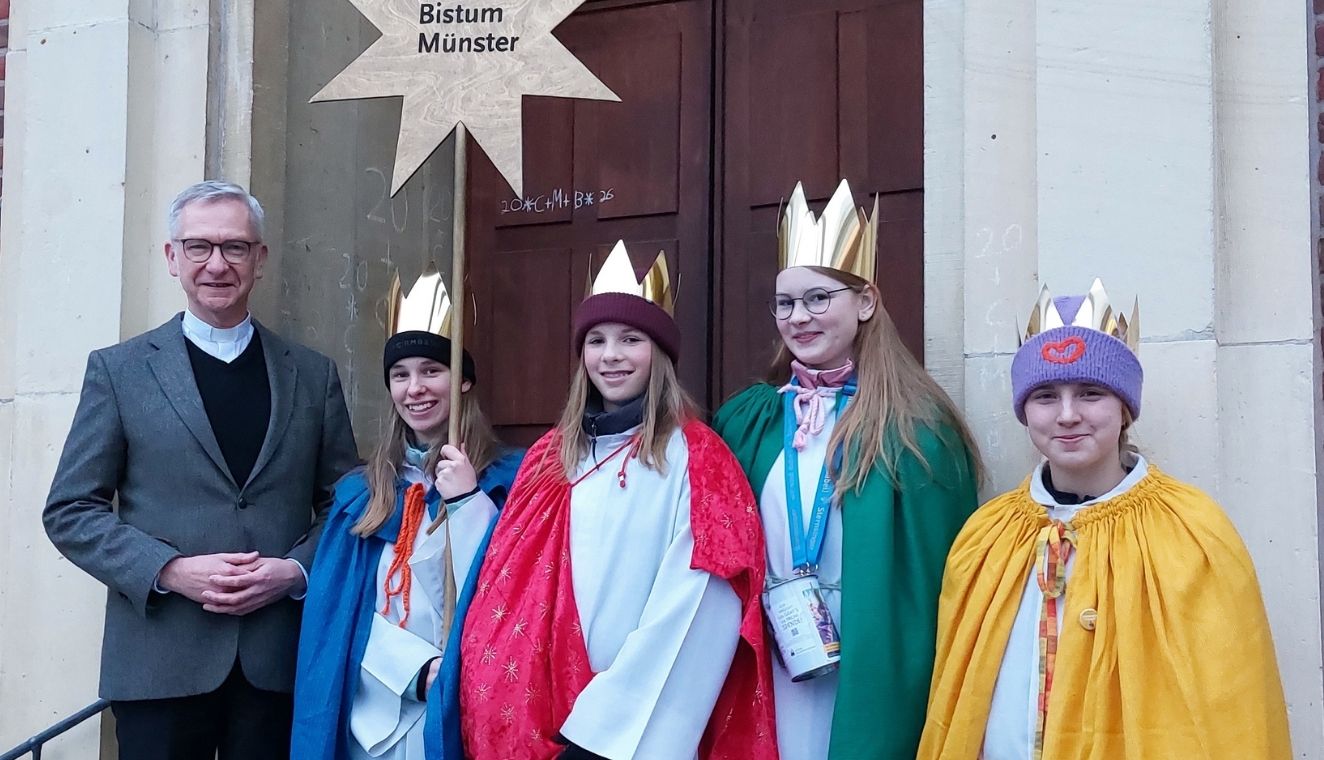 Vier Sternsingerinnen aus der Kirchengemeinde St. Clemens Hiltrup-Amelsbüren überbrachten Diözesanadministrator Dr. Antonius Hamers (links) und den Beschäftigten des Bischöflichen Generalvikariats den Segen 20*C+M+B+26.