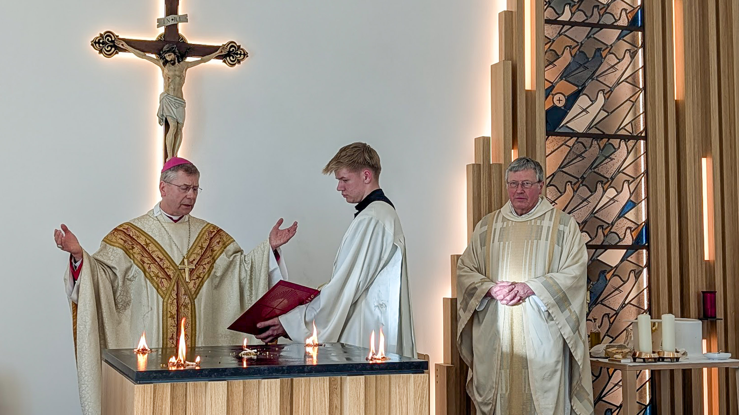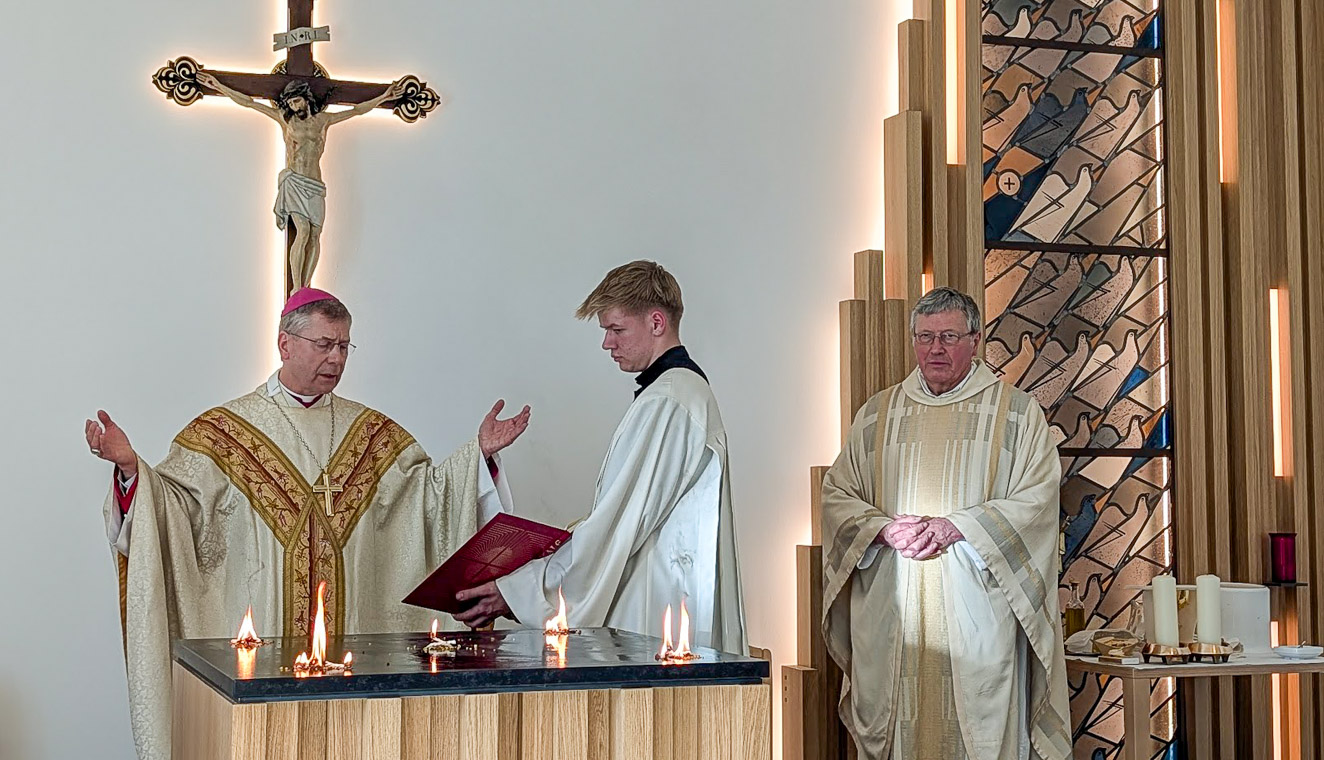 Weihbischof Zekorn besprengte den Altar mit Weihwasser. Bekleidet mit einer Schürze goss er Chrisam-Öl auf den Altar und salbte ihn damit. Auf fünf Stellen auf dem Altar, die an die Wundmale Christi erinnern, stellte er Schalen mit Weihrauch, die er mit dem Licht der Osterkerze entzündete. Es folgten das Weihegebet sowie die Reinigung des Altars und das Auflegen des Altartuchs. Dann wurden Kerzen, Blumen und das Altarkreuz aufgestellt. Nach der Zeremonie feierte der Weihbischof die Eucharistie an dem geweihten Altar. In den Dienst genommen und gesegnet wurden außerdem der Ambo und der Tabernakel, auch das Ewige Licht wurde entzündet.