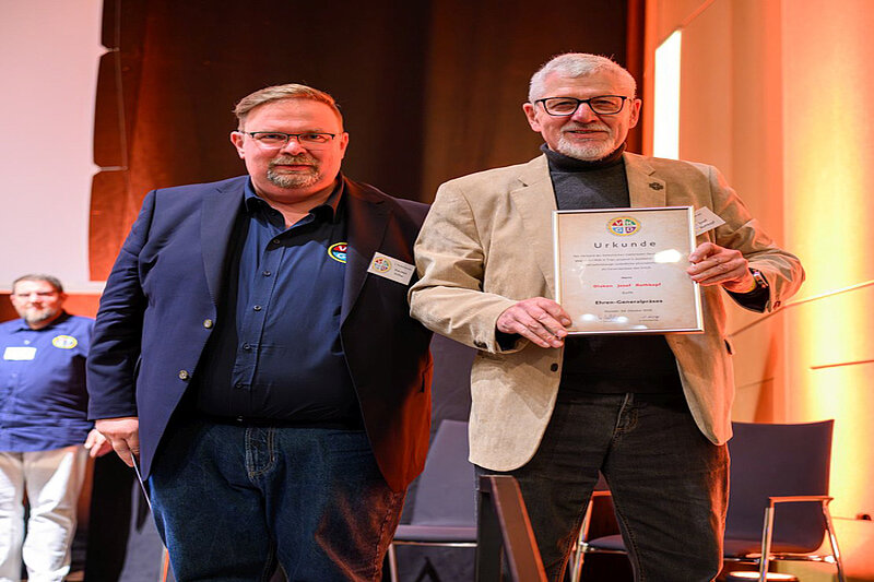 Nach 22 Jahren im Amt wurde der langjährige Generalpräses Diakon Josef Rothkopf, der selbst hörgeschädigt ist, anschließend feierlich verabschiedet. In einer emotionalen Fotoschau blickte der Verband auf sein Lebenswerk zurück – von der Kindheit bis zu seiner Tätigkeit als Seelsorger. Rothkopf, der seine Ausbildung zum Diakon trotz großer Hürden 1999 abschloss, war der erste hörgeschädigte Generalpräses des Verbandes. Unermüdlich bereiste er die Vereine im ganzen Land, oft mit dem Zug, und wurde dabei stets von seiner Frau Brigitte unterstützt.