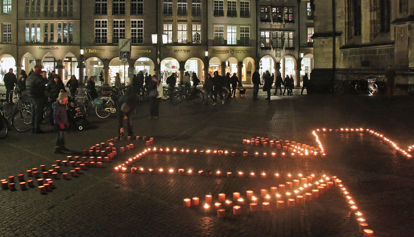 Während in Warendorf und Bocholt bereits am vergangenen Samstag 500 Kerzen geleuchtet haben und sie in Emsdetten am 10. November angezündet werden, werden sie in den meisten Orten am kommenden Wochenende (17. November) aufgestellt. Dann sind Coesfeld, Havixbeck, Marl, Münster, Rheine und Rees-Haldern dabei. Geldern beschließt die Aktion am 24. November. Traditionell ist das Bistum Münster bei der Aktion „Eine Million Sterne“ besonders stark vertreten.