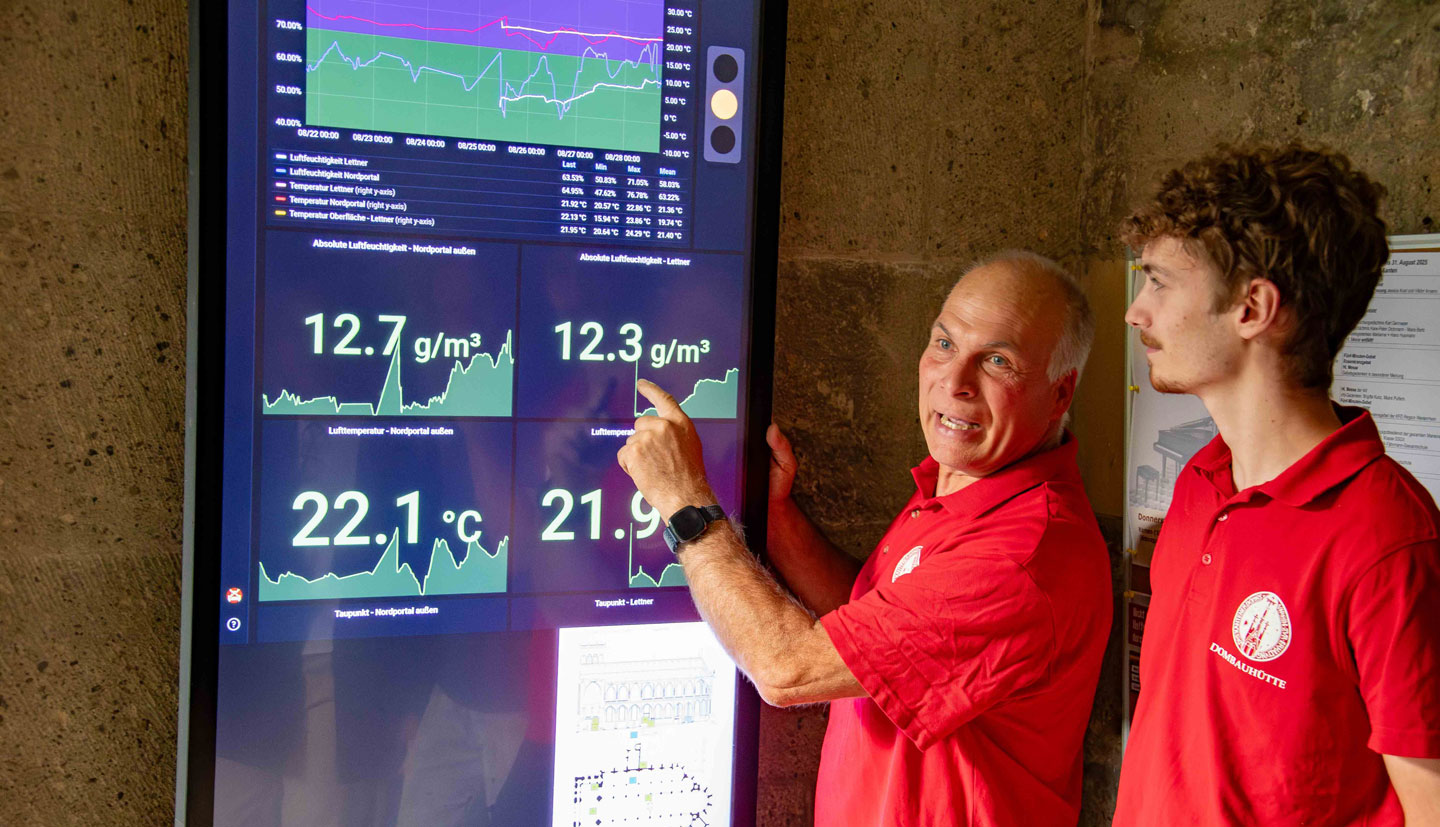 Die nun eingebaute Automatisierung aber ist, wie Dombaumeister Johannes Schubert betont, nicht nur eine Frage der Bequemlichkeit, durch die das Treppensteigen reduziert wird, sondern entscheidend dafür, dass ein anderes Projekt erfolgreich anläuft: Die Überwachung des Raumklimas im Xantener Dom mithilfe Künstlicher Intelligenz (KI). Zwar messen schon seit 2019 zahlreiche Sensoren – entwickelt und immer wieder angepasst durch das HRW-Team von Professor Becker – Temperatur, Feuchtigkeit, Druck und weitere Parameter und geben so Auskunft über die aktuelle Situation. „Durch eine Ampel wird den Verantwortlichen, zum Beispiel den Küstern, dann angezeigt, ob ein Wert kritisch ist und gehandelt werden muss durch Lüften, Heizen oder Trocknen“, erklärt Schubert. Allerdings dauert es, die mehr als 40.000 Kubikmeter Luft, die der Dom umschließt, so zu steuern, dass alles wieder „im grünen Bereich“ ist. Denn sonst besteht die Gefahr, dass Feuchtigkeit an Wänden, Kunstwerken oder in den Textilien kondensiert und so Schimmel entsteht.