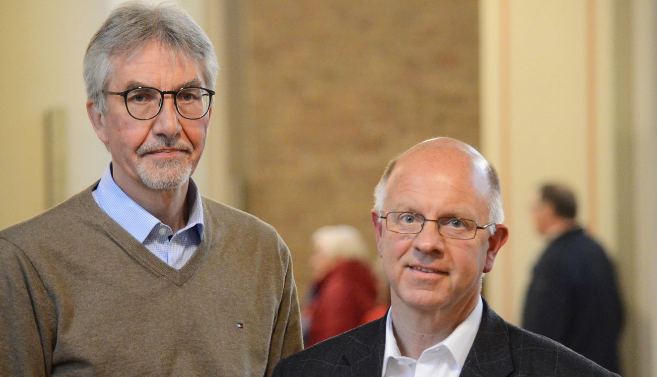 Pfarrer Stefan Dördelmann (rechts) und Ulrich Berlekamp erläuterten zusammen mit den beauftragten Architekten das Immobilienkonzept für den Kirchort Laggenbeck.