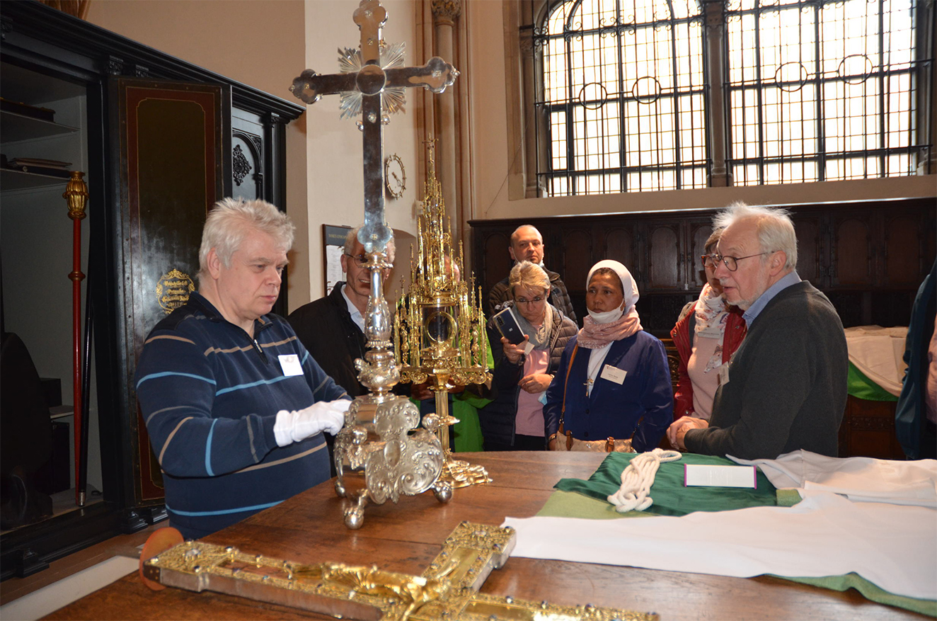 In der Sakristei des Doms zeigt Ewald Ikemann den Kolleginnen und Kollegen aus anderen Bistümern unter anderem die Kapitelkreuze.