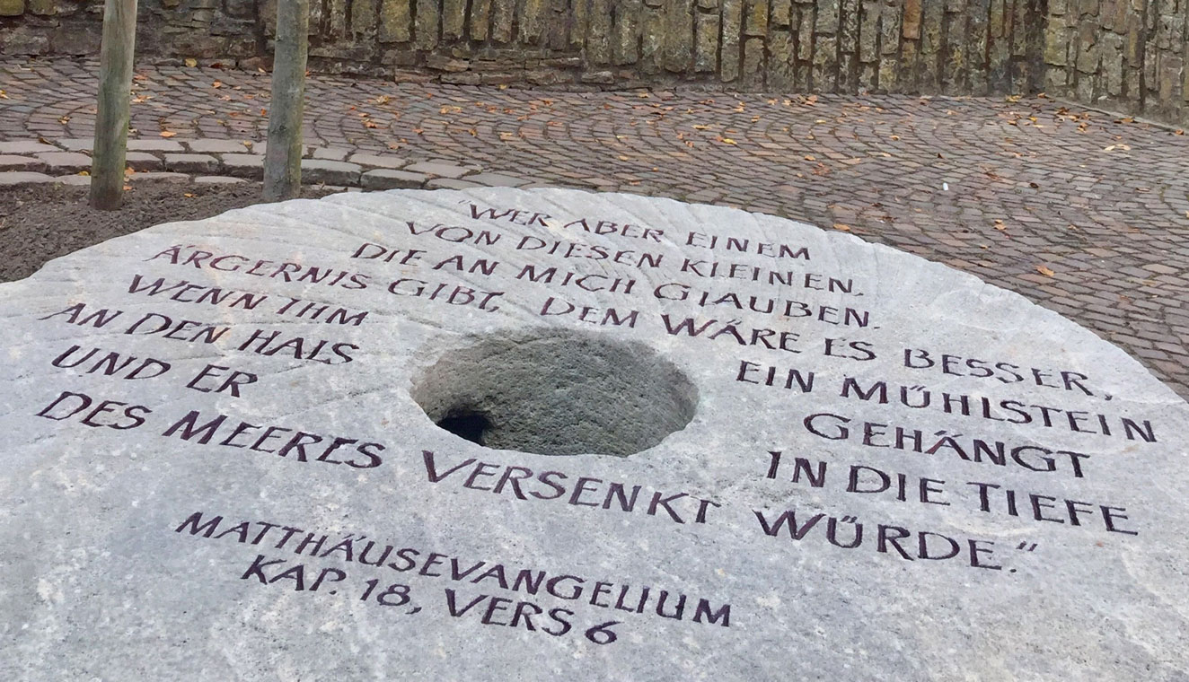 Elf Jahre lang reiste die Initiative mit einem Mühlstein durch ganz Deutschland, Ende September 2018 war der Mühlstein auch in Münster aufgestellt worden. Der 800 Kilogramm schwere Mühlstein hat einen Durchmesser von 1,40 Metern und trägt eine Inschrift aus dem Matthäus-Evangelium: „Wer aber einem von diesen Kleinen, die an mich glauben, Ärgernis gibt, dem wäre es besser, wenn ihm ein Mühlstein an den Hals gehängt und er in die Tiefe des Meeres versenkt würde.“