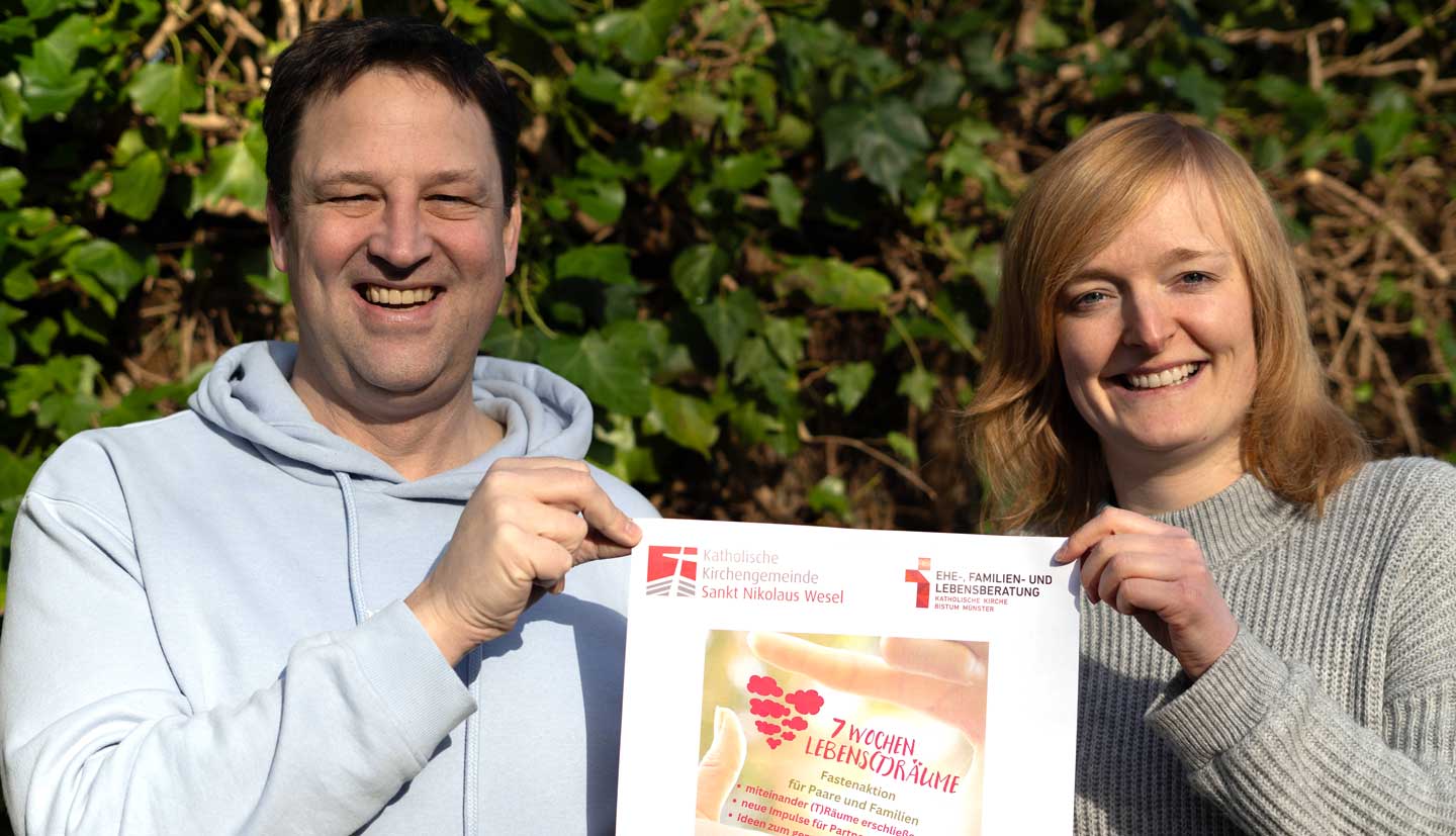 Die Aktion der „Arbeitsgemeinschaft für katholische Familienbildung“ läuft bundesweit, in Wesel möchten die EFL sowie die Pfarrei St. Nikolaus das Angebot aber noch erweitern. „Wir laden die Teilnehmerinnen und Teilnehmer aus der Region dazu ein, sich bei uns zu melden“, sagt Pastoralreferent Martin Bußmeier. So können die individuellen Erfahrungen der Familien und Paare bei Bedarf begleitet und unterstützt werden. Wer möchte, kann sich nicht nur bei einem ersten Treffen zu Beginn der Aktion am Sonntag, 18. Februar, informieren, sondern ist auch zu einem gemeinsamen Abend nach der Osterzeit eingeladen. „Uns ist es als Pfarrei wichtig, dass wir auch für Paare und junge Familien passende Angebote haben und mit ihnen im Austausch sind, dass wir sie aber auch untereinander in Kontakt bringen“, betont der Pastoralreferent. Aus Gesprächen mit anderen Familien und Paaren könnten alle positive Impulse für ihr eigenes Leben bekommen, ist sich Bußmeier sicher.