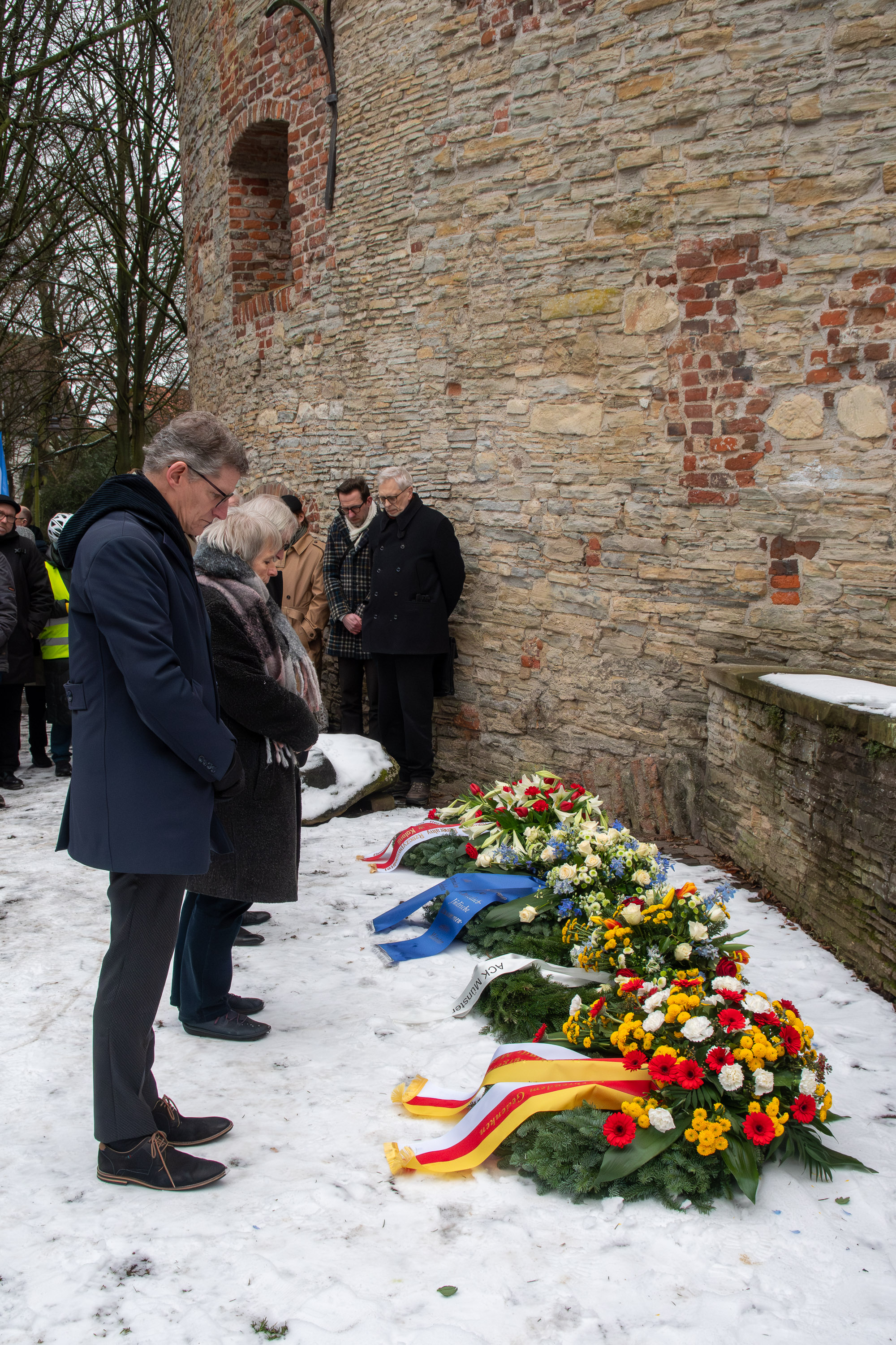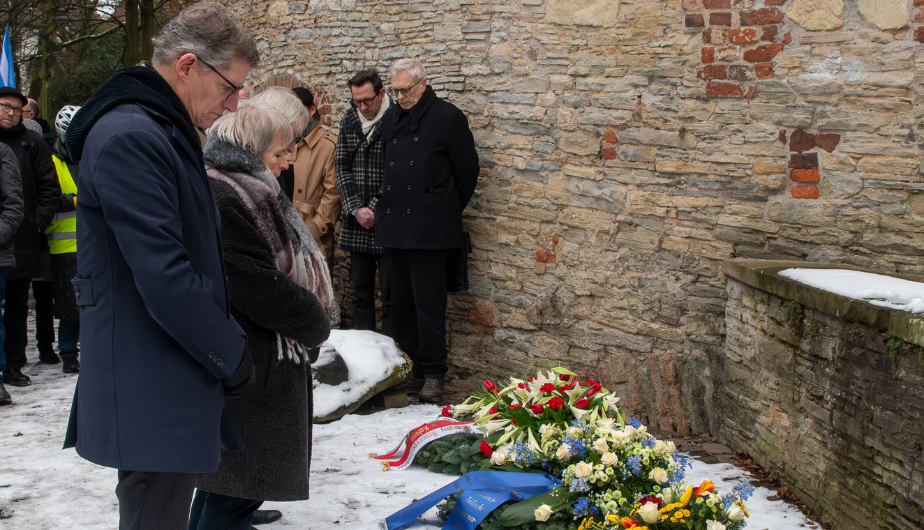 Zuvor hatten Vertreterinnen und Vertreter der Stadt Münster, der Arbeitsgemeinschaft Christlicher Kirchen (ACK) und der Gesellschaft für Christlich-Jüdische Zusammenarbeit Kränze am Zwinger auf der Promenade niedergelegt – an dem Ort, an dem einst Menschen von der Gestapo ermordet wurden.