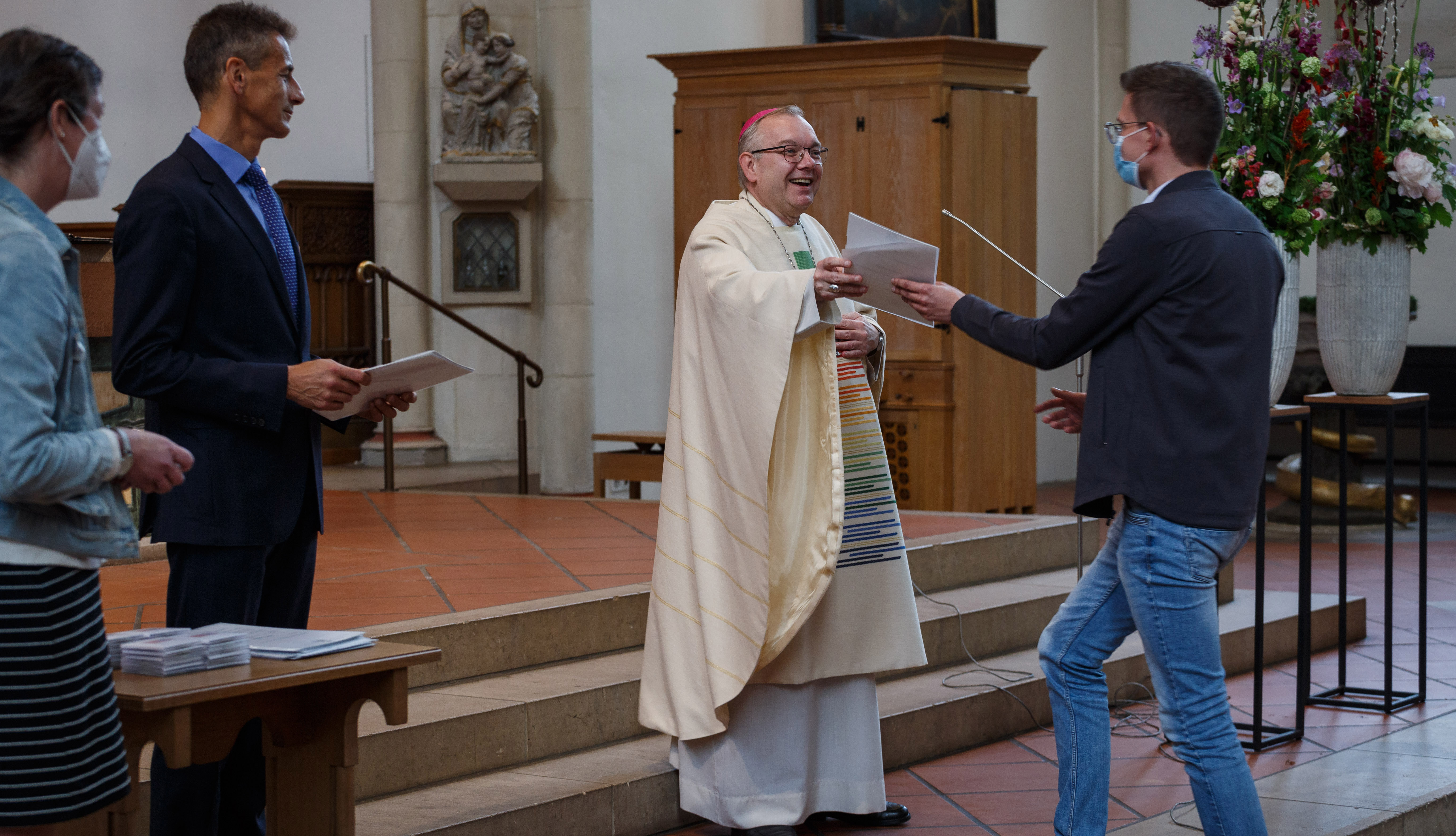 Zum Ende der Messe hin überreichte Schulte außerdem noch einen Abschieds-Blumenstrauß an Monika Appler von der Bezirksregierung Münster. Die Leitende Regierungs-Schuldezernentin arbeitete in der Ausbildung der Religionslehrerinnen und -lehrer lange mit dem Bistum Münster zusammen. Jetzt geht sie in den Ruhestand. Musikalisch gestaltete Organist Alexander Toepper den Gottesdienst.