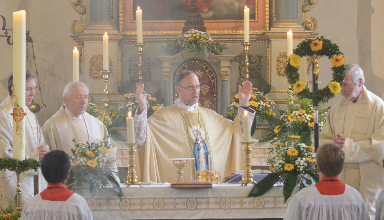 Weihbischof Rolf Lohmann eröffnete am 1. Mai die Wallfahrtssaison in Eggerode. Zu Beginn des Gottesdienstes hatte Pfarrer Thomas Diedershagen (links) den Gast vom Niederrhein begrüßt.