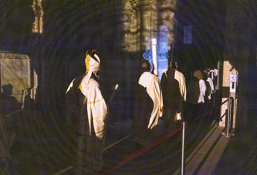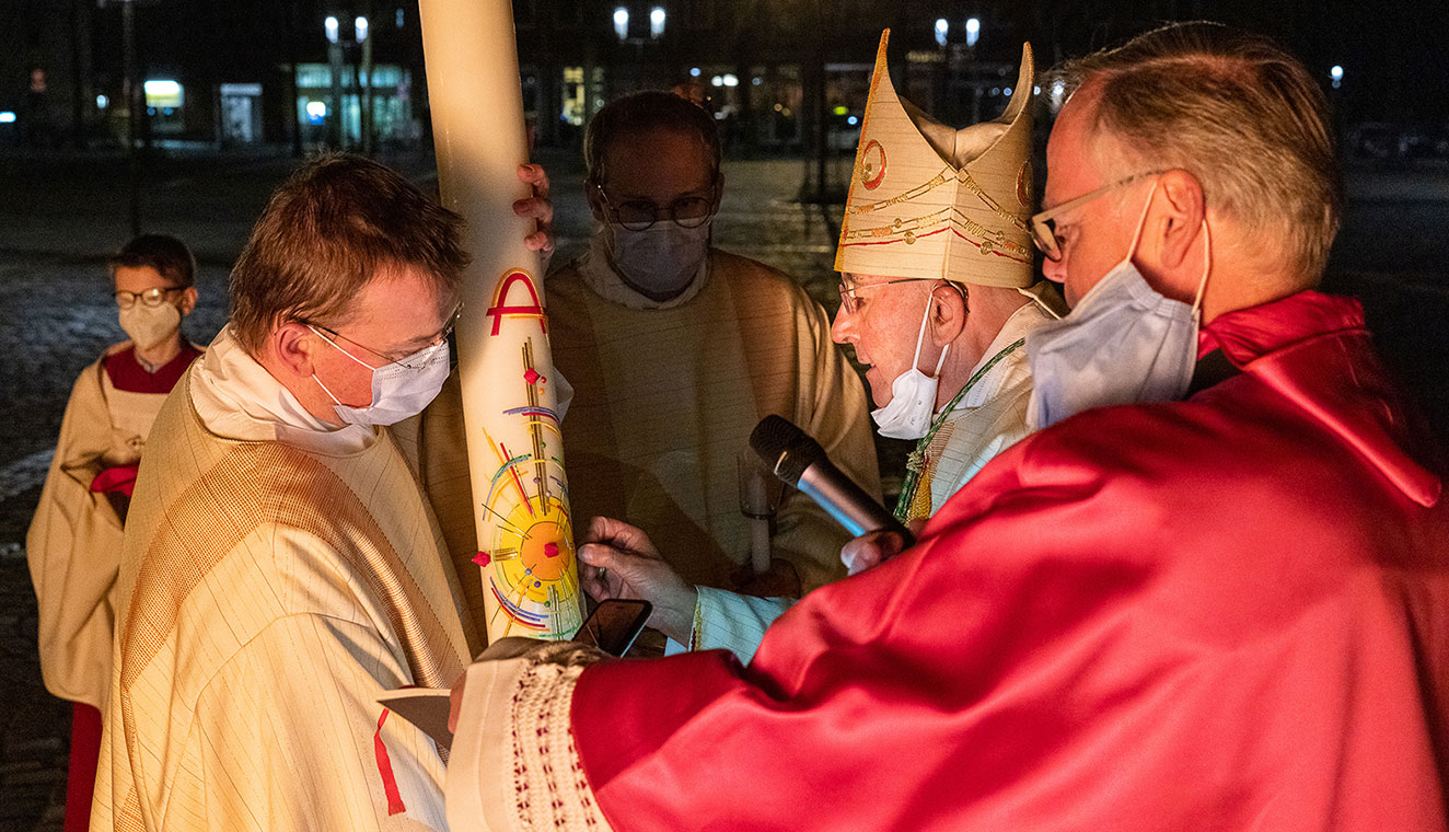 Es könne, sagte Bischof Genn, durchaus „ein Trost sein, zu wissen, dass in der Osterbotschaft zunächst einmal davon die Rede ist, dass er nicht hier ist, dass es die Erfahrung der Abwesenheit gibt, dass selbst die Erscheinungen ihn immer wieder auch als den Ungreifbaren erkennen lassen“. Wichtig sei aber mit in den Blick zu nehmen, was im Lukasevangelium im Anschluss an die Szene der Frauen am Grab geschildert werde: die Begegnung zweier Jünger auf dem Weg nach Emmaus mit dem Auferstandenen, die durch sein Wort und das Brechen des Brotes erfahren, dass die Botschaft der Frauen die Wahrheit ist. Bischof Genn: „Das ist unser Osterweg gerade in dieser Zeit der gefühlten und wirklichen Abwesenheit Gottes und seiner Ferne: Mit seinem Wort und unseren Fragen im Austausch zu bleiben, unterwegs zu sein, zu ertasten, dass die Weisheit Gottes tatsächlich als Gekreuzigter und Auferstandener auf dieser Erde erschienen ist, so dass alle, die an seinem Wort festhalten und ihn nicht aufgeben wollen, Leben finden können und Hoffnung haben.“
