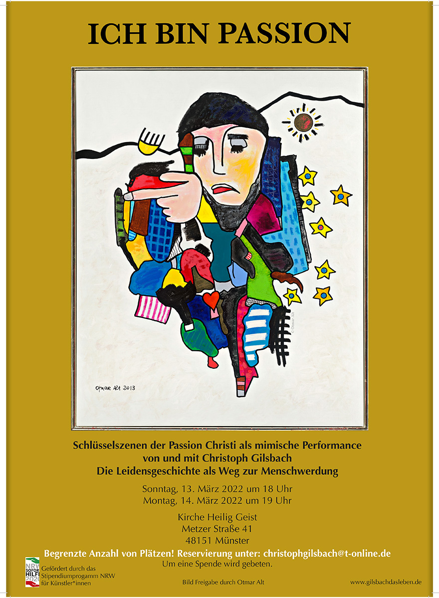 Mit „Ich bin Passion“ zeigt Gilsbach den Zwiespalt zwischen Annahme und Ablehnung einer Last und lässt die Einsamkeit spürbar werden, die Jesus auf seinem Leidensweg begleitet haben muss. Unterstützt wird seine Darstellung von eingespielten Gesängen und Texten des Vokalensembles „ELBCANTO“, darunter meditative Musik wie Taizé-Gesänge. Der Maler Otmar Alt stellte sein Werk „Die Erschaffung der Welt“ als Titelbild zur Verfügung, auf dieser Grundlage entwickelten Gilsbach und sein Team das weitere Bühnenbild.