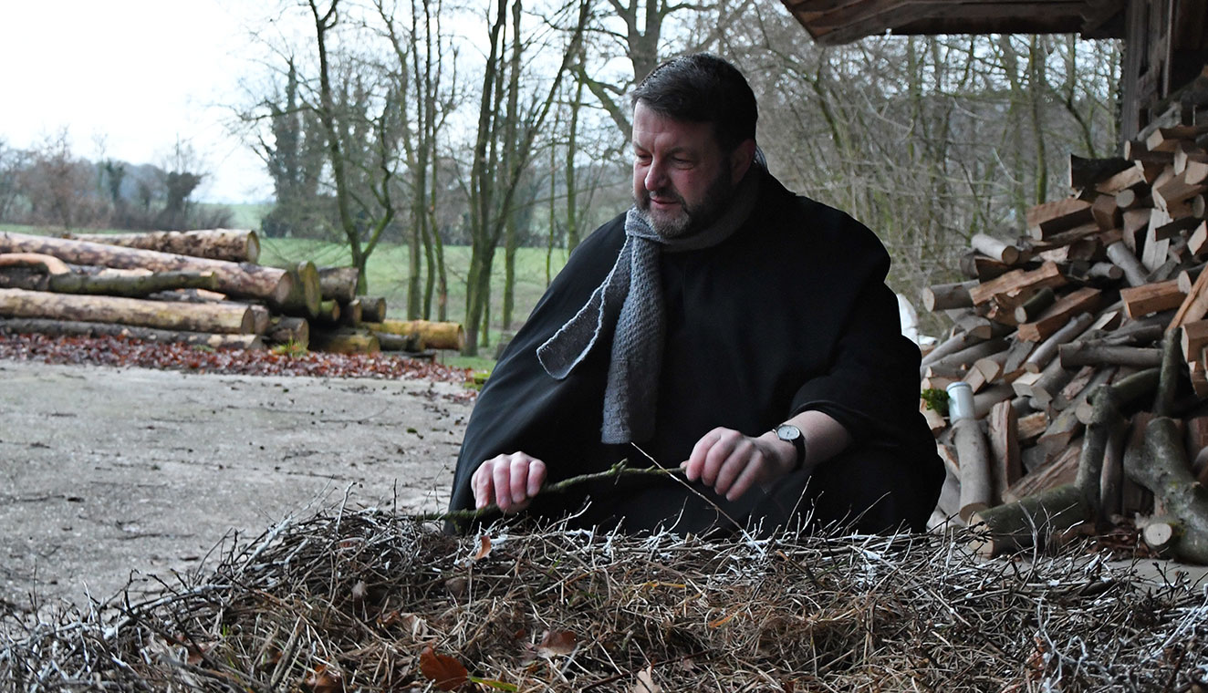 Von der Idee bis zur Realisierung, ein Storchenpärchen auf dem Hof unterhalb der Abtei in Gerleve anzusiedeln, sind rund drei Jahre vergangen. „Ich habe mich im Internet informiert, wie ein Storchenhorst gebaut wird“, berichtet Pater Kilian. Die Unterkonstruktion hat ihm ein Dachdecker gebaut. Dann legte er selbst Hand an. An zwei Nachmittagen schaffte er mit verschiedenen Zweigen und Gras die Grundlage für das Nest mit einem Durchmesser von 1,50 Metern. „Wenn die Störche es annehmen, bauen sie es selber noch weiter aus“, erklärt er.