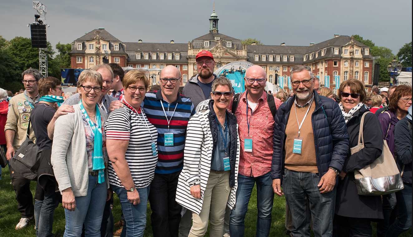 Am Ziel der langen Reise angekommen sind auch die 14 Radpilger, die sich aus Langförden und Schillig auf den Weg machten, um über 450 Kilometer bis zum Katholikentag mit Muskelkraft zu meistern. Richtig gut gelaunt blickten sie auf den Abend der Begegnung am Mittwoch zurück. Auf dem Schlossplatz genossen sie es, gemeinsam den Gottesdienst zu feiern.