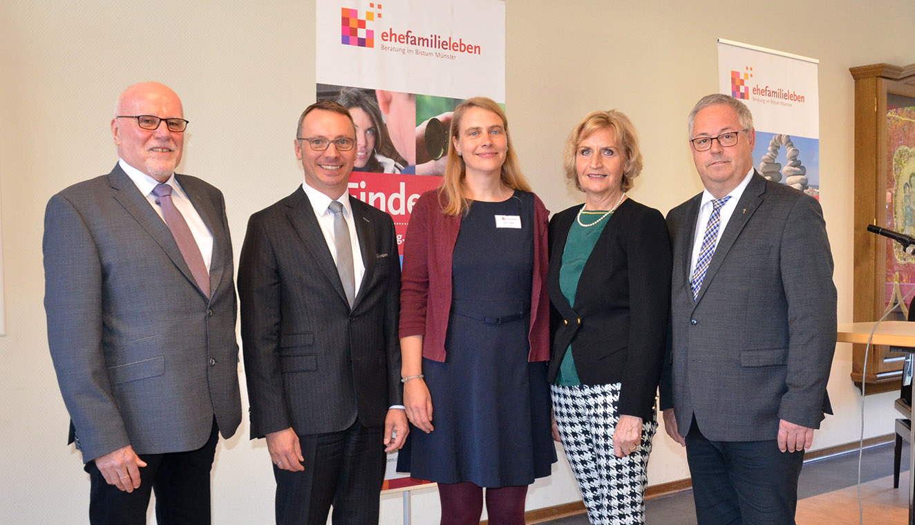 Über das 50-jährige Bestehen der EFL in Warendorf freuten sich zusammen mit Leiterin Petra Häder (Mitte) Winfried Kaup, Dr. Markus Wonka, Doris Kaiser und Pfarrer Peter Lenfers (von links).