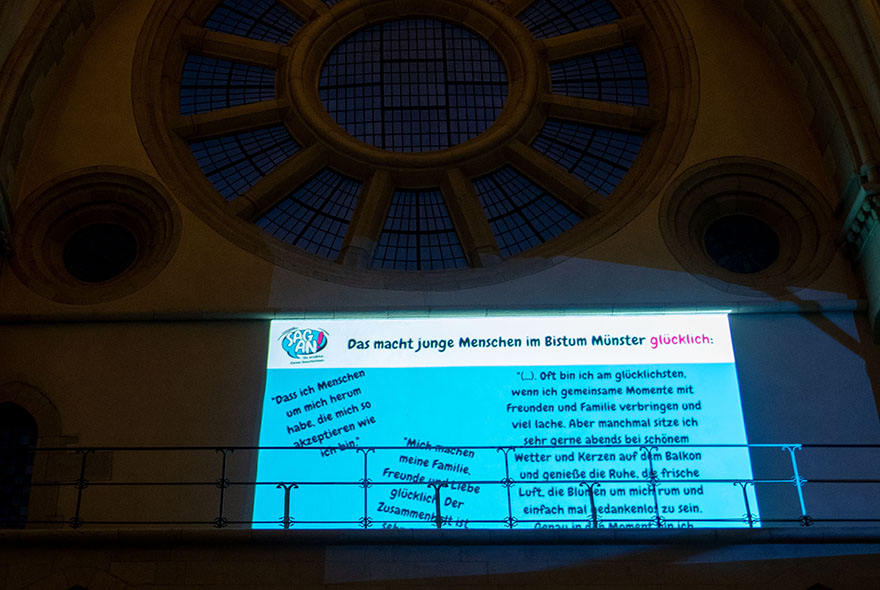 Die Antworten der Jugendlichen, die bislang eingegangen sind, müssten sichtbar gemacht werden, ermutigt Susanne Deusch: „Ich wünsche mir, dass die Antworten nicht nur im Dom zu sehen sind, sondern auch in Pfarreien und an anderen Orten im Bistum.“ Diese Möglichkeit gibt es: Die Präsentation mit den ersten Ergebnissen sowie weitere Materialien können bei den Verantwortlichen angefragt werden: Susanne Deusch: Telefon 0251 495-6076, E-Mail deusch@bistum-muenster.de; Christian Wacker: Telefon 0251 495-474, E-Mail wacker@bistum-muenster.de; Saskia Tietz (Öffentlichkeitsarbeit): Telefon 0251 495-6369, E-Mail tietz-s@bistum-muenster.de. Zudem wird die Präsentation bei den kommenden „Langen Freitagen im Dom“ am 12. November und 8. Dezember von 19.30 Uhr bis Mitternacht zu sehen sein.