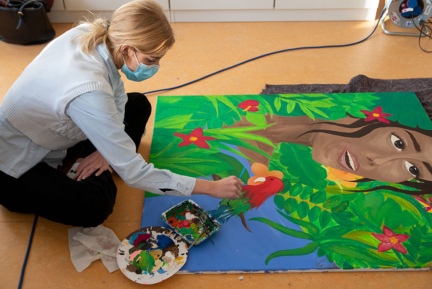 Kunstlehrerin Jutta Everwin ist beeindruckt vom Engagement der Schüler, die sogar während der Herbstferien und an Samstagen an den Bildern weiter gearbeitet haben: „Es ist einfach toll, wie viel Herzblut sie in dieses Projekt stecken“, sagt sie und bezieht auch die Schüler mit ein, die den digitalen Part übernehmen und kurze Videos vom Entstehungsprozess anfertigen sowie eine Weihnachtskarte mit Fotos entwerfen.