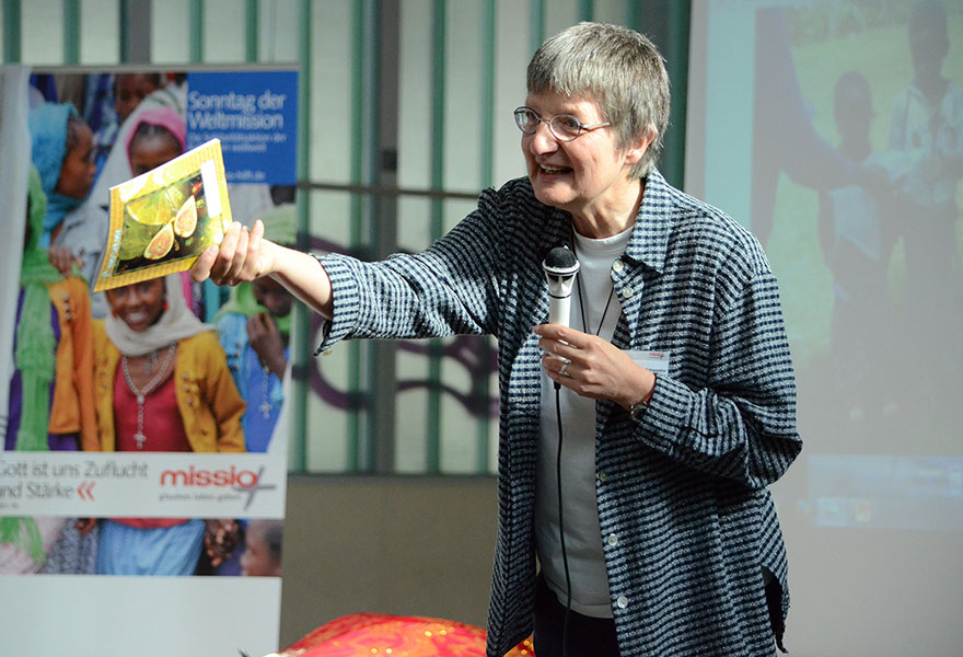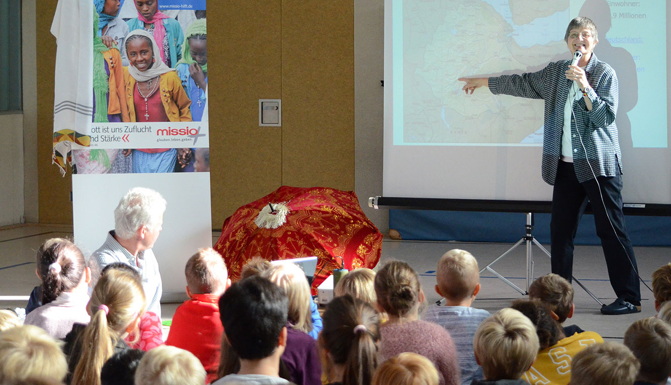 Aufmerksam lauschten die Acht- und Neunjährigen den Ausführungen von Schwester Rita, die die Schülerinnen und Schüler immer wieder einbezog. Zum Abschluss lernten sie sogar noch ein Lied in der Landessprache Äthiopien: auf Amharisch. „Das ist ein Danklied. Ich möchte euch zu einer Dankprozession durch die Turnhalle einladen“, forderte die 61-Jährige die Mädchen und Jungen auf, ihr zu folgen. Mit ihrer Prozession sagen die Kinder singend Danke dafür, dass es ihnen so gut geht. Nach diesem Besuch wurde ihnen wieder einmal mehr deutlich, wie gut sie in Deutschland leben.