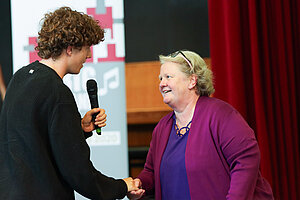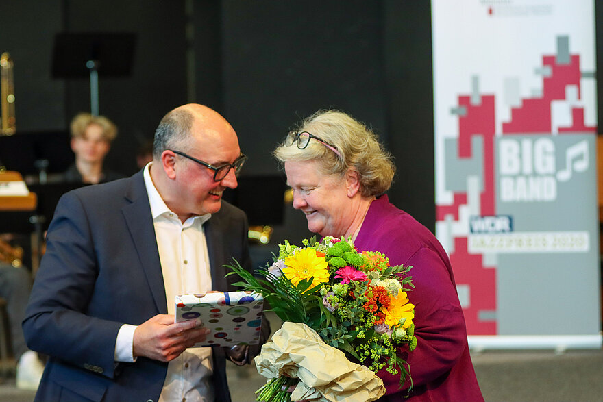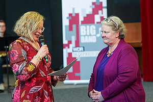 Ein besonderes Highlight der Feier war ein eigens komponiertes „Lied für Birgit Weiß“, das Wendel Altekamp gemeinsam mit Schaf Dörthe vortrug. Für den festlichen musikalischen Rahmen sorgte die Big-Band der Schule unter der Leitung von Lukas Lüffe.