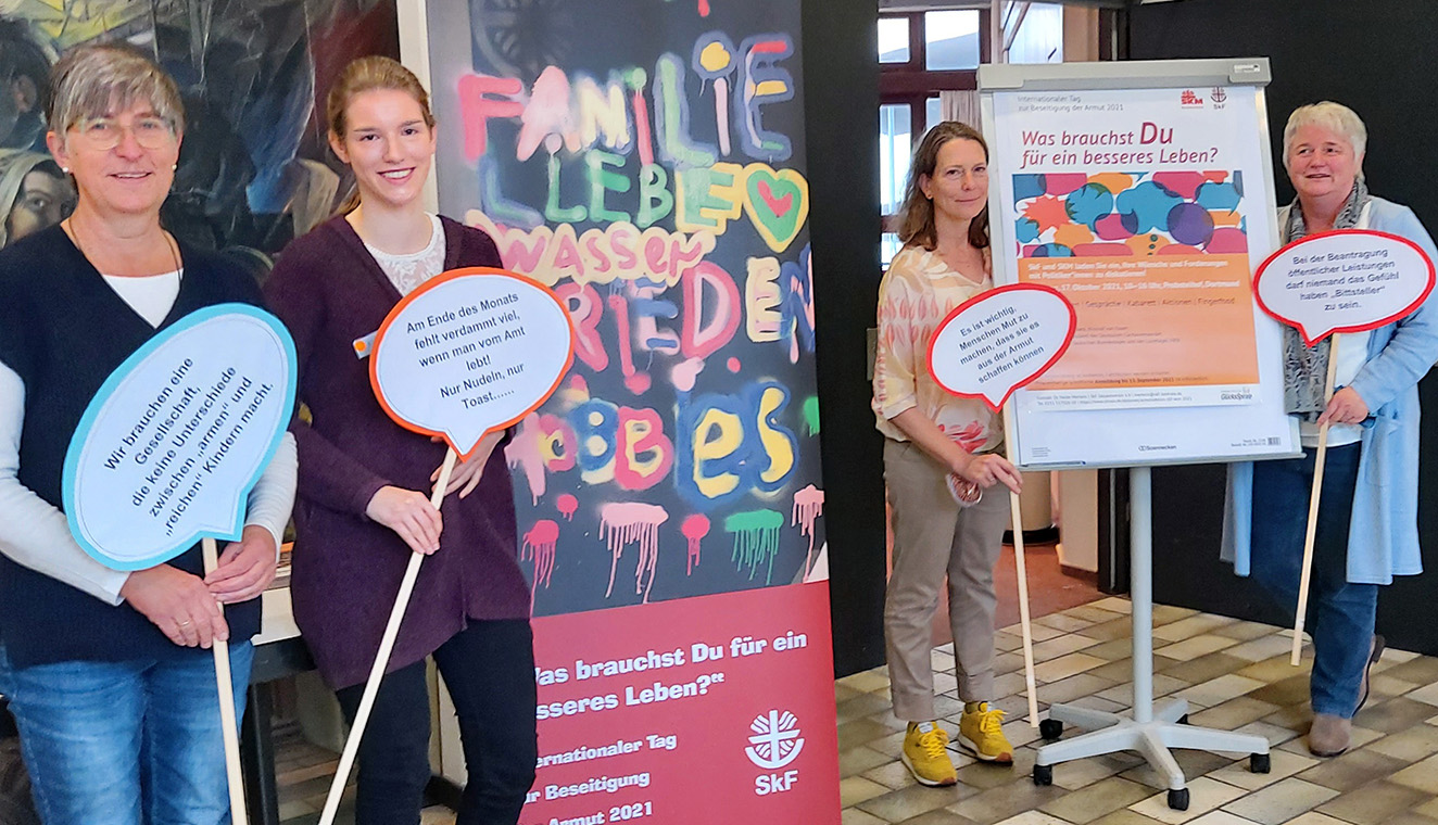 © SkF IbbenbürenIbbenbürens SkF-Geschäftsführerin Barbara Kurlemann sowie Kolleginnen aus der allgemeinen Sozialberatung und der Wohnungsnotfallhilfe Gabriele Andresen und Stefanie Weßels und Svea Nitsche, Vorsitzende des Sozialausschusses der Stadt Ibbenbüren, diskutierten beim Fachtag in Dortmund mit von Armut betroffenen Menschen, Expertinnen und Experten sowie Politikerinnen und Politikern. Unter der Überschrift „Was brauchst du für ein besseres Leben?“ waren betroffene Menschen sowie Fachkräfte der Verbände aufgerufen, ihre Forderungen für ein Leben ohne Armut zu benennen. Dazu hatten auch Besucherinnen und Besucher des Sozialkaufhauses und der Tafel Ibbenbüren Wünsche und Forderungen formuliert. „Oft sind es die einfachen, kleinen – für viele Menschen ganz normalen -- Dinge, die sich nicht erfüllen lassen, wenn Leben an der Armutsgrenze stattfindet“, betonte Barbara Kurlemann.