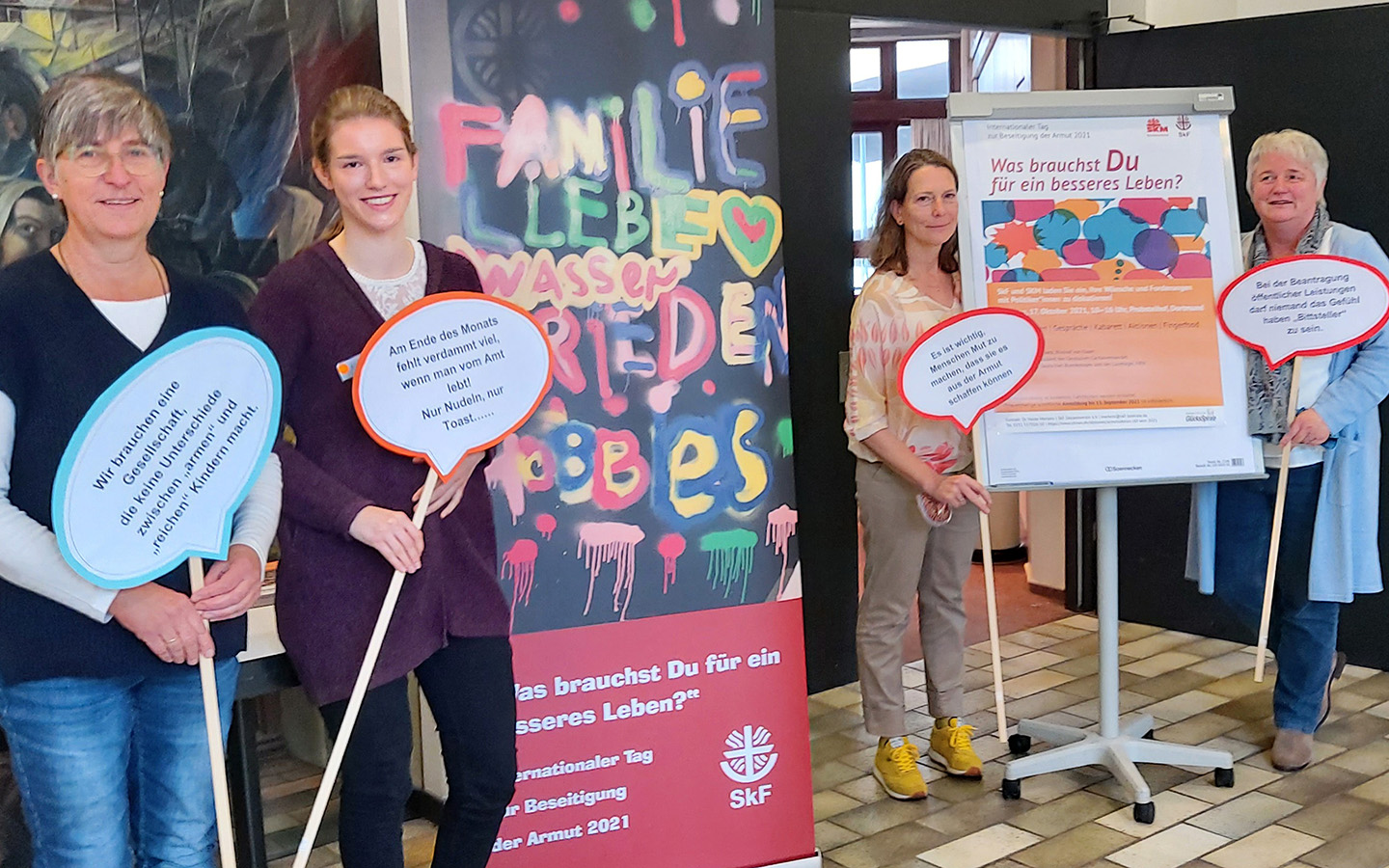 Nicht der Mangel an Geld, sondern die massiv eingeschränkten Möglichkeiten der Teilhabe am Leben in der Gesellschaft betreffe Menschen in Armut am stärksten, stellten die Vorsitzenden Hildegard Eckert und Heinz-Georg Coenen das Ergebnis einer nicht repräsentativen Umfrage vor. „Menschen mit Armutserfahrungen wünschen sich sehnlich ein Ende der Stigmatisierung in einer Gesellschaft des Überflusses“, fasste Hildegard Eckert die wichtigste Forderung nach der Auswertung von mehr als 400 Fragebögen zusammen. „Sie wollen mit ihren Kindern am sozialen Leben teilhaben und nicht ständig die Erfahrung von Ausgrenzung machen müssen.“ Die nächste Bundesregierung müsse die Bekämpfung der Armut in Deutschland entschieden angehen.