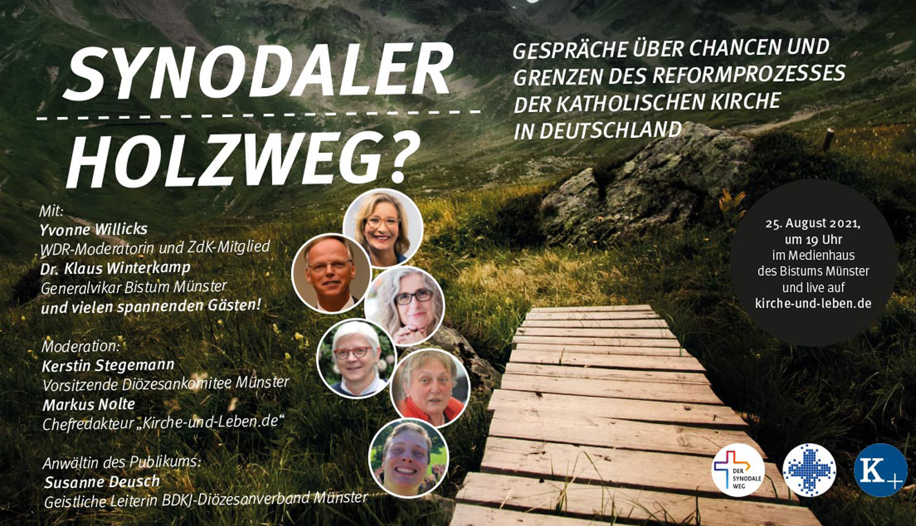 Moderiert wird der Abend von Kerstin Stegemann, Vorsitzende des Diözesankomitees der Katholiken im Bistum Münter, und Markus Nolte, Chefredakteur von „Kirche-und-Leben.de“. Susanne Deusch, Geistliche Leiterin des BDKJ-Diözesanverbands, wird als „Anwältin des Publikums“ die Positionen der Zuschauerinnen und Zuschauer in die Diskussion einbringen.