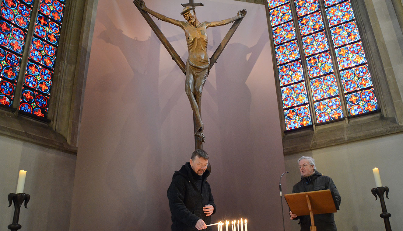 Die Andacht startet mit einem musikalischen Impuls von Kantorin Kathrin Borda. Anschließend werden Worte aus der Bibel vorgetragen wie beispielsweise die Lesung des Tages oder ein Psalm. Dann halten die Seelsorgenden Fürbitte. Für jede Bitte stellen sie eine Kerze vor das Kreuz. „Es ist ein Passionskreuz, ein Schmerzenskreuz. Es zeigt Jesus, der mit uns leidet und unsere Schmerzen mitträgt. Ihm können wir unsere Bitten anvertrauen“, sagt Arntz. Ein gemeinsames Vaterunser sowie ein Lied aus dem Gotteslob beschließen die Andacht. Für die Zeit des Kreuzgebetes ist die St.-Lamberti-Kirche geschlossen.