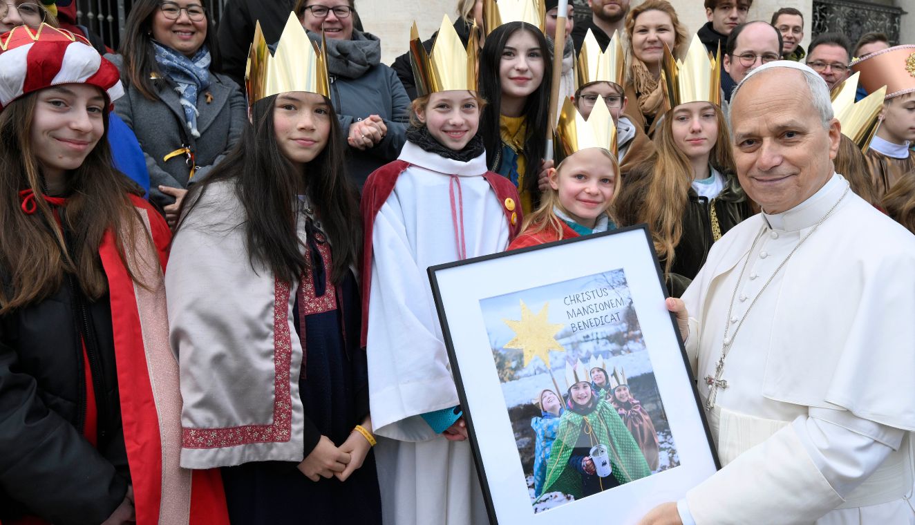 Bei der Generalaudienz am Silvestertag auf dem Petersplatz stellten die vier Sternsingerinnen Mia, Pia, Theresa und Anna aus der Pfarrei St. Franziskus in Marl dem Heiligen Vater ihr Engagement beim Dreikönigssingen vor und überreichten ein gerahmtes Foto von Sternsingerinnen und Sternsingern mit dem Segen „Christus mansionem benedicat“.
