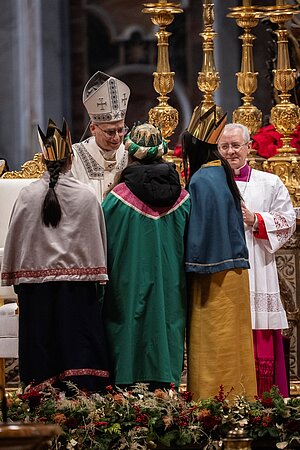 In ihren festlichen Gewändern und mit glänzenden Kronen brachten Mia und Anna aus Marl gemeinsam mit der österreichischen Sternsingerin Clara aus dem Burgenland beim Neujahrsgottesdienst im Petersdom die Gaben zu Papst Leo XIV. an den Altar.