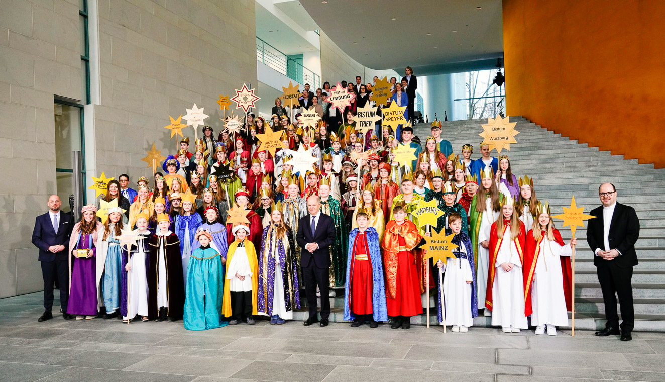 108 Königinnen und Könige aus allen 27 deutschen Diözesen sind traditionell in Berlin mit dabei. Seit 1984 bringen die Sternsingerinnen und Sternsinger ihren Segen „Christus mansionem benedicat – Christus segne dieses Haus“ ins Bundeskanzleramt. Aus allen Himmelsrichtungen reisen sie in ihren prächtigen Gewändern, mit ihren goldenen Sternen und glänzenden Kronen in die Bundeshauptstadt.